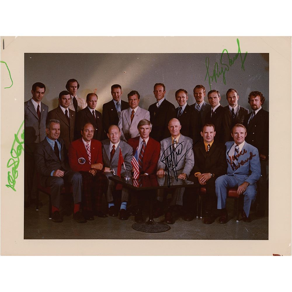 Color glossy 9.5 x 7 photo of the various American and Soviet crew members involved with the historic Apollo-Soyuz Test Project, signed in black felt tip by Tom Stafford, in brown felt tip by Vance Brand, and in green felt tip by Deke Slayton and Valeri Kubasov. In fine condition, with creasing to the border corners. Accompanied by a full letter of authenticity from Zarelli Space Authentication.