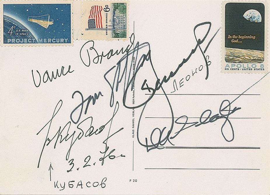 Felt tip and ballpoint signatures of the full crew of the Apollo-Soyuz mission—Vance Brand, Deke Slayton, Tom Stafford, Alexei Leonov, and Valeri Kubasov—on the reverse of a 5.75 x 4.25 postcard. In fine condition.