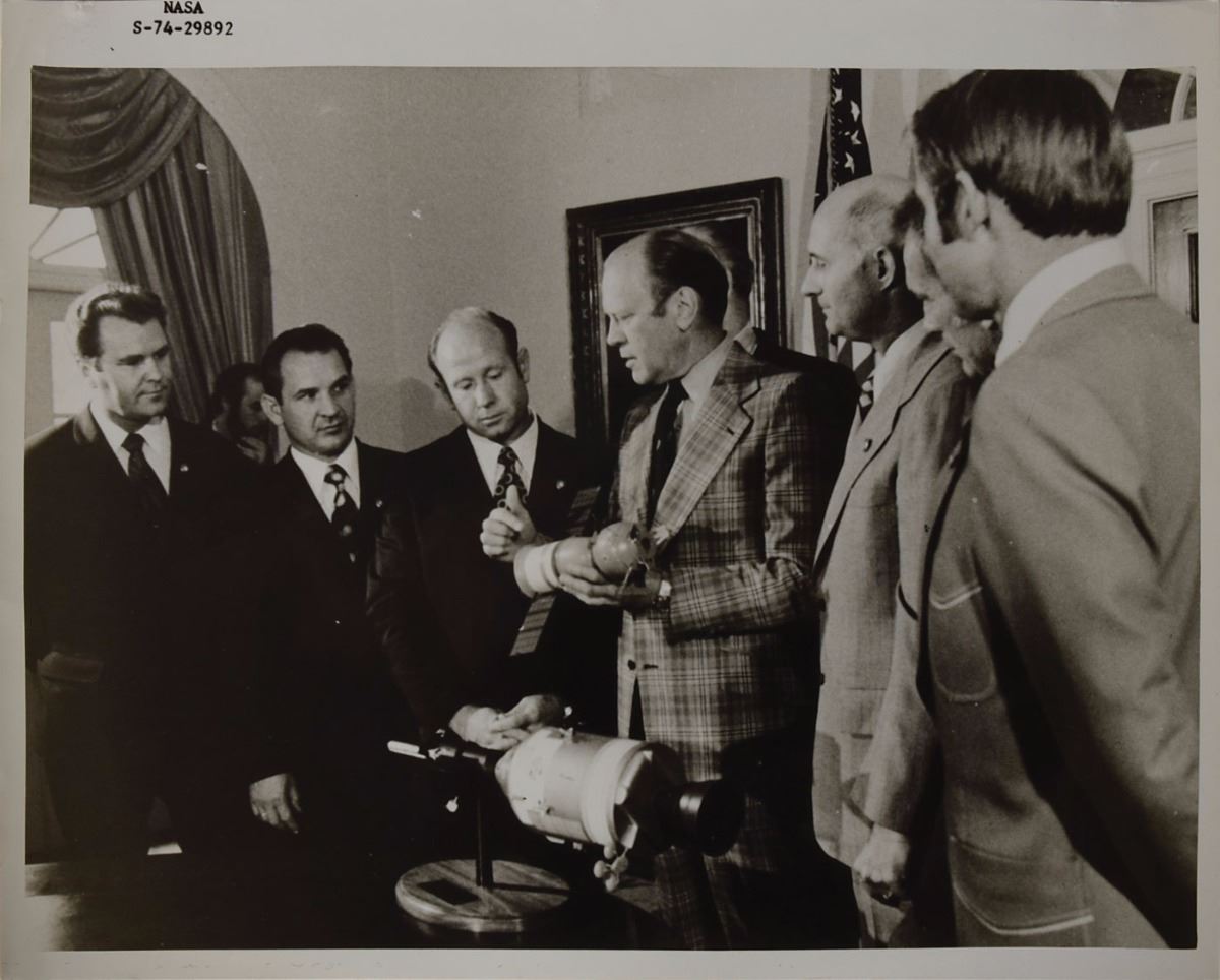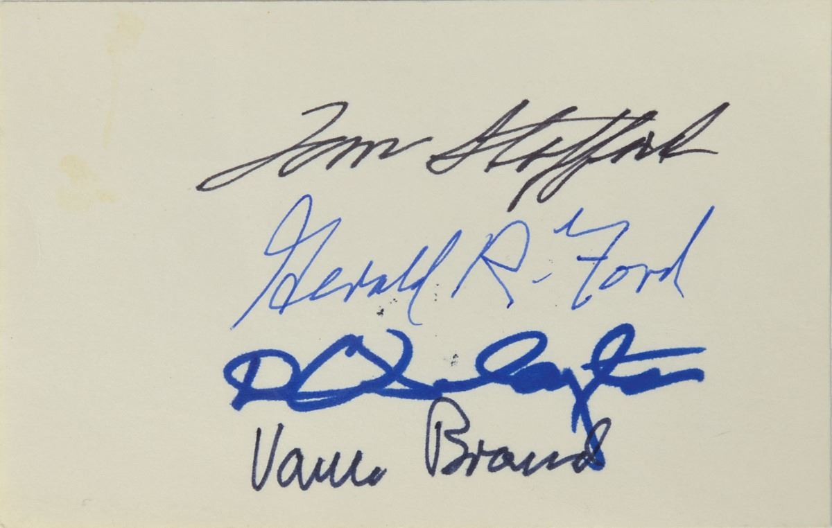 Two items: an official Apollo-Soyuz commemorative cover, signed in ink by President Gerald R. Ford, Deke Slayton, Tom Stafford, and Vance Brand; and felt tip signatures of Ford, Stafford, Slayton, and Brand on a white 5 x 3 card. In overall fine condition. Accompanied by an unsigned official black-and-white 10 x 8 NASA photo of Ford meeting with the ASTP astronauts at the White House. From the collection of aerospace memorabilia specialist Ken Havekotte. Pre-certified Zarelli Space Authentication.