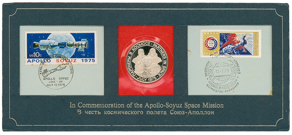Presented is a 1.5-inch diameter souvenir coin issued in celebration of the Apollo-Soyuz mission. Displayed with two canceled Apollo-Soyuz postage—one from the US and the other from the USSR—in a 10.25 x 4.75 folder.
