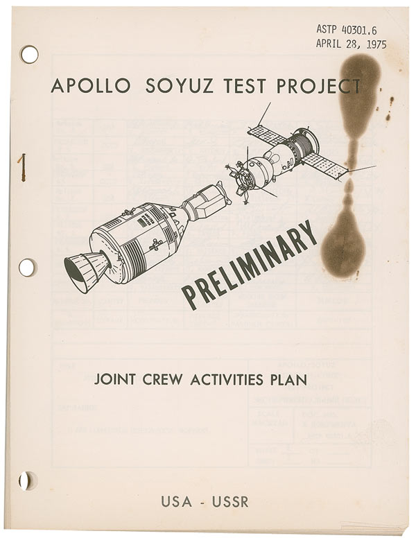 Apollo Soyuz Test Project preliminary Joint Crew Activities Plan, dated April 28, 1975, 8.25 x 10.5. Detailed plan gives mission requirements, flight plan guidelines, mission operations plan, onboard joint operations instructions, and a detailed timeline of the mission. Staining to top right of front cover and opening pages, otherwise fine condition.