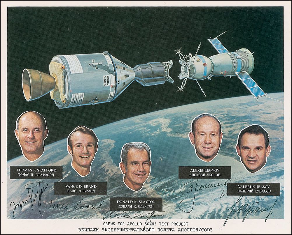 Color 10 x 8 NASA composite photo of the crews of the Apollo-Soyuz mission, signed in black ink by Deke Slayton, Vance Brand, Tom Stafford, Alexei Leonov, and Valeri Kubasov. In fine condition. Photo originates from the Deke Slayton Family collection.