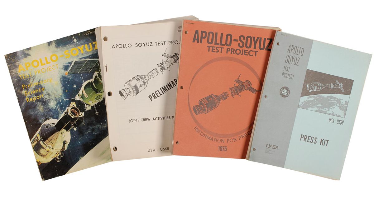 Four items: Apollo Soyuz Test Project preliminary Joint Crew Activities Plan, dated April 28, 1975, 8.25 x 10.5. Detailed plan gives mission requirements, flight plan guidelines, mission operations plan, onboard joint operations instructions, and a detailed timeline of the mission; Huge Apollo-Soyuz Preliminary Science Report, issued by NASA in 1976, 8 x 10. Report is full of photos, diagrams, reports, and experiment results from the mission; Apollo-Soyuz Test Project press kit, issued in 1975, 8 x 10.5, 204 pages, detailing spacecraft descriptions, docking procedures, various systems, television plans, and crew biographies; and an Apollo-Soyuz press kit, 8 x 10.5, 113 pages, distributed before the Apollo-Soyuz mission in 1975. Detailed kit gives information about the crews, mission profile, and experiments to be conducted. Forward of the kit states, in part: “This document contains information about the Apollo Soyuz Test Project and consists of two parts prepared by the U.S. and the U.S.S.R. respectively…The Soviet and American parts have been prepared individually.” In very good condition, with some light creasing, toning, and soiling, and the expected wear.