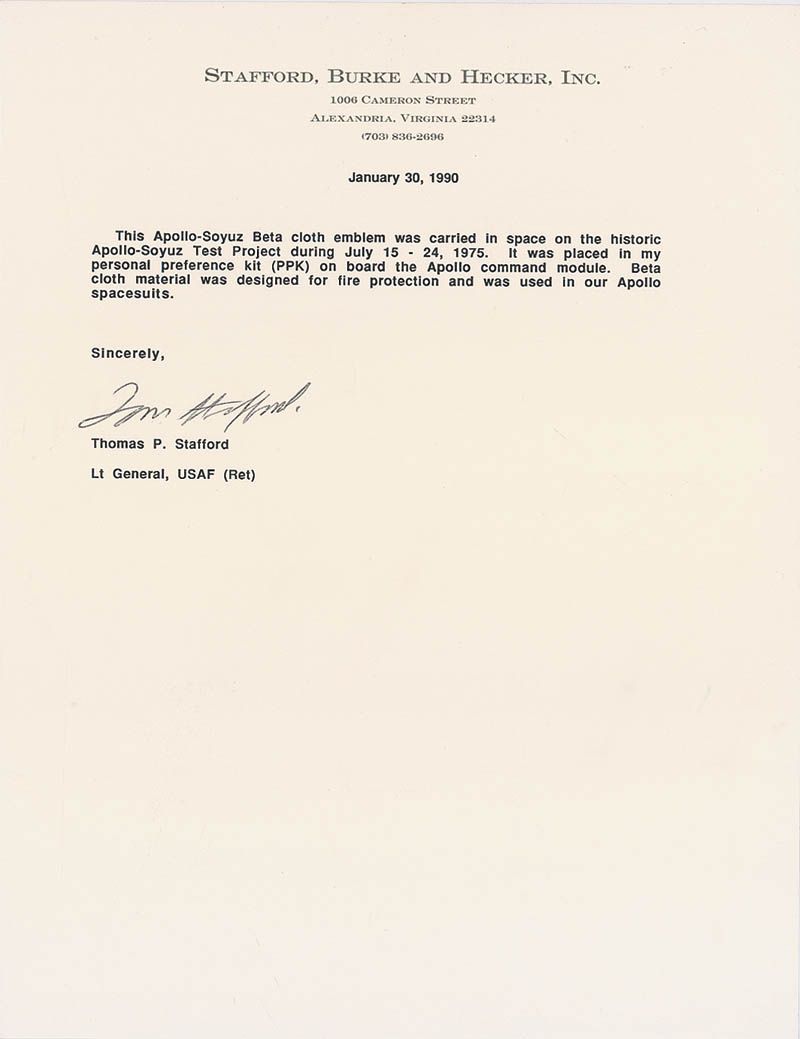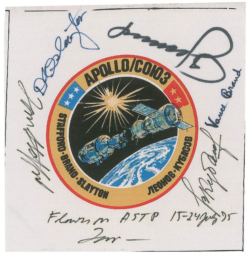 Flown Beta cloth, carried to space during the Apollo-Soyuz mission. Swatch measures 5.25 x 5.75 with a printed color 3.25? diameter mission emblem in the center. Signed at the bottom, “Flown on ASTP 15–24 July 75, Tom,” and signed in the borders in ink and felt tip by Tom Stafford, Deke Slayton, Vance Brand, Alexei Leonov, and Valeri Kubasov. Accompanied by a 1990 letter of authenticity from Tom Stafford stating the cloth “was placed in my personal preference kit (PPK) on board the Apollo command module.” In fine condition, with some mild haloing to several of the signatures.