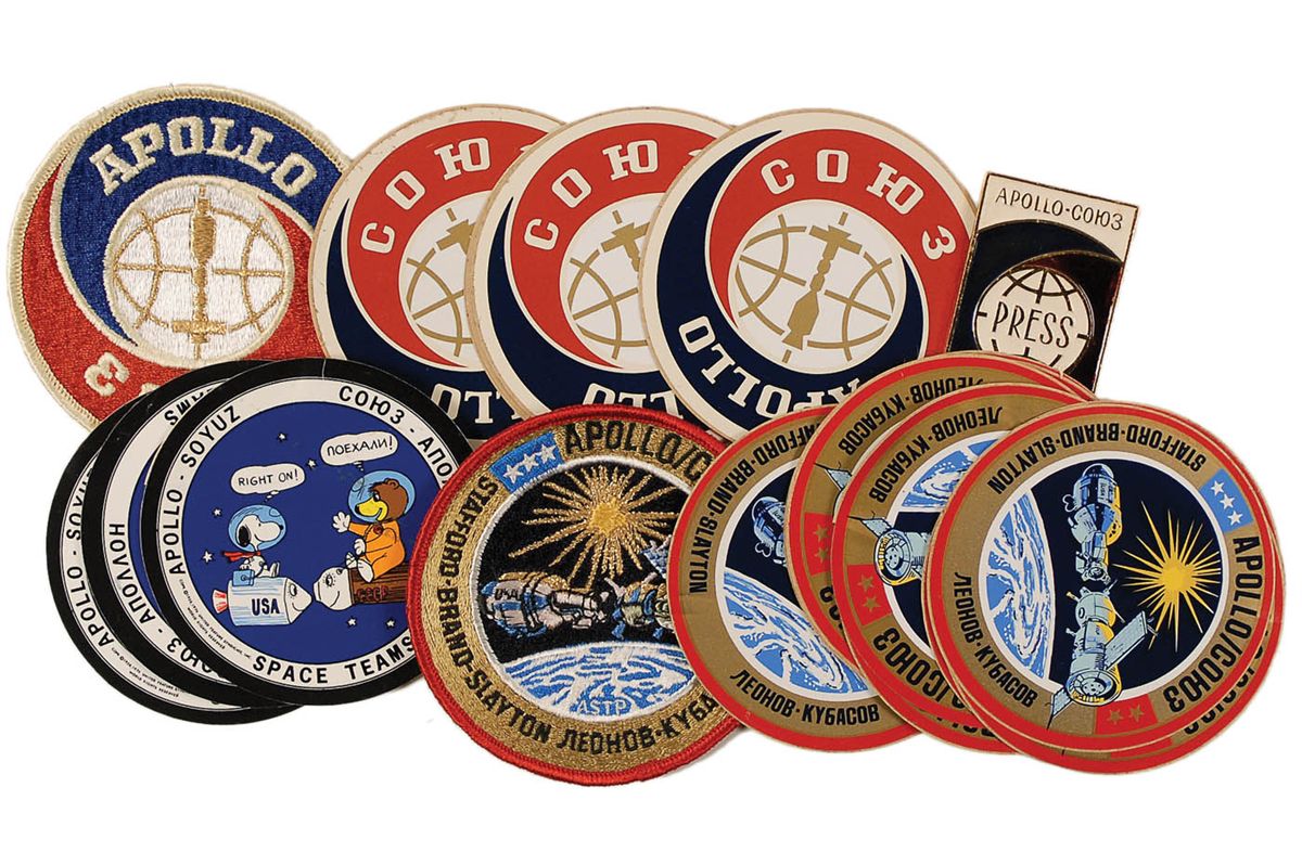 Collection of Apollo-Soyuz patches and decals: two different 4? diameter mission patches, one American and one Russian; three 3.5? decals showing Snoopy meeting a Russian bear in space; 15 decals of a mission patch; five decals of the Russian patch; and a 1.75 x 2.5 metal mission press pass, missing the pin. In fine condition.