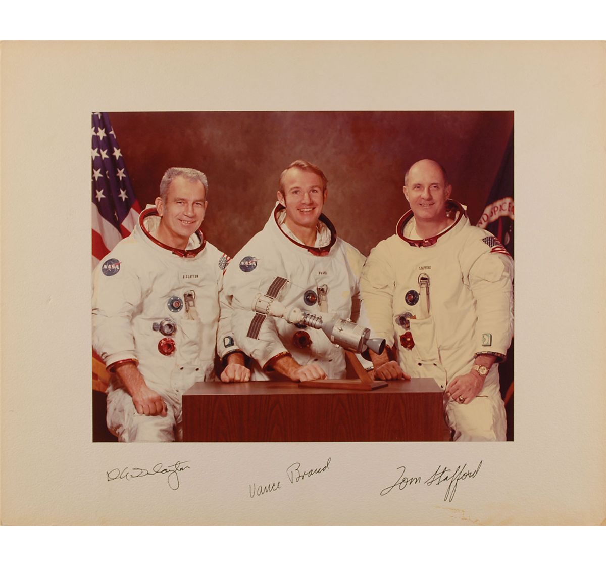 Color 13.5 x 10.75 photo of the American astronauts of the Apollo-Soyuz mission posing in their space suits with a model of the docked capsules, affixed to its original 20 x 16 mount, signed on the mount in black ink by Deke Slayton, Vance Brand, and Tom Stafford. In fine condition, with some mild toning to mount.