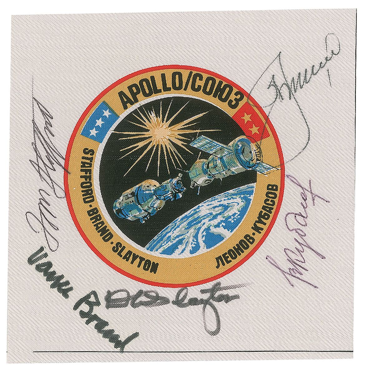 Exceptional flown 5.5 x 5.5 Beta cloth swatch from Deke Slayton’s personal collection, with a 3.25? mission insignia printed in the center, signed around the insignia in black ink by Deke Slayton, Tom Stafford, Vance Brand, Alexei Leonov, and Valeri Kubasov. In fine condition. Accompanied by a certificate of authenticity signed by his wife, Bobbie Slayton, in part: “This is to certify that this autographed Beta cloth belonged to my husband, Deke Slayton, and was flown in 1975 on the Apollo-Soyuz mission. It was locked in his safe deposit box along with other flown memorabilia.”
