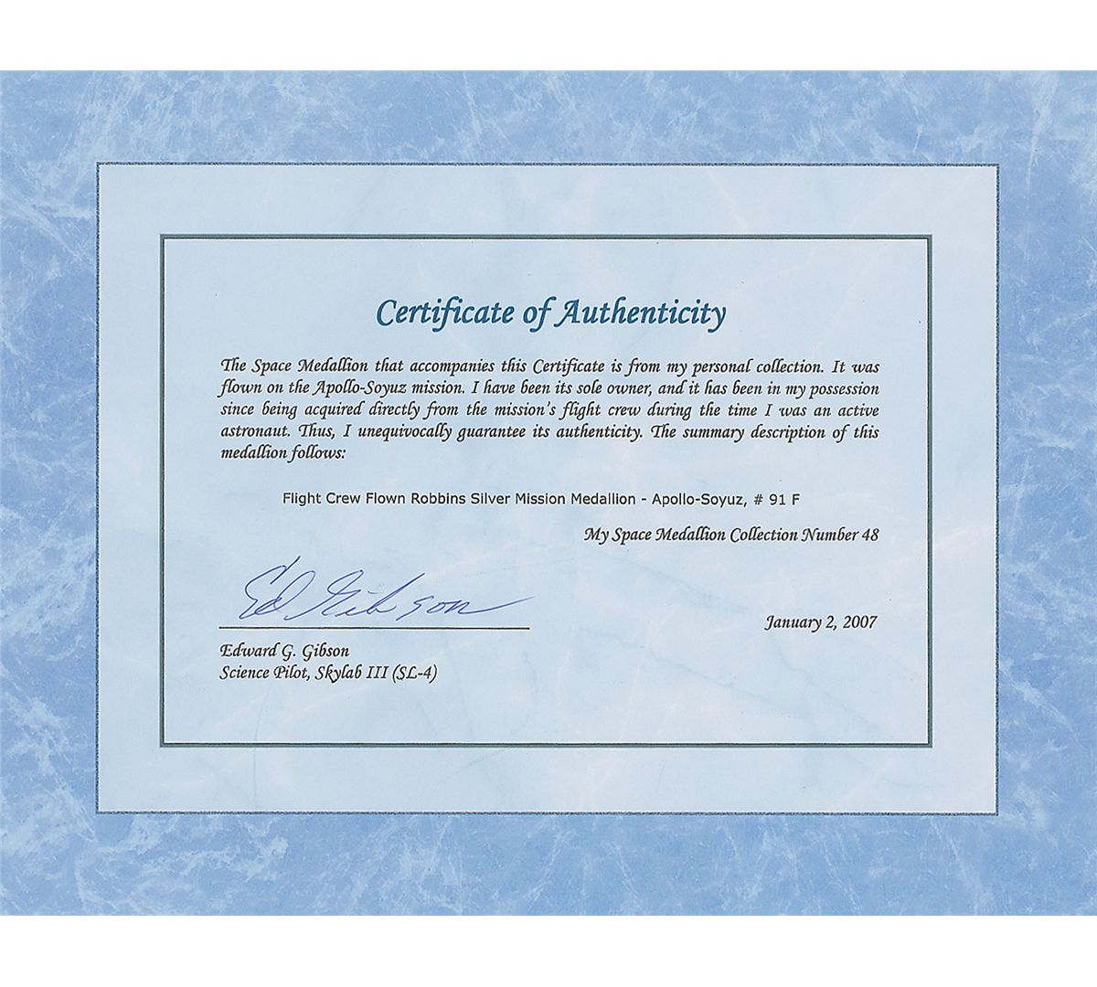 Flown Apollo-Soyuz Robbins Medal, approximately 1.25” diameter, with a raised design on the face of the mission insignia, and the mission and astronauts’ names in both English and Cyrillic alphabets. The reverse of the sterling silver medal is engraved with the launch and re-entry dates, as well as “First Joint US-USSR Space Flight.” Medal is serial numbered on the rim, “91F,” along with the sterling and Robbins hallmarks. Normal condition. Accompanied by a 2007 certificate of authenticity from astronaut Ed Gibson, stating the medal “was flown on the Apollo-Soyuz mission…and has been in my possession since being acquired directly from the mission’s flight crew during the time I was an active astronaut.”
