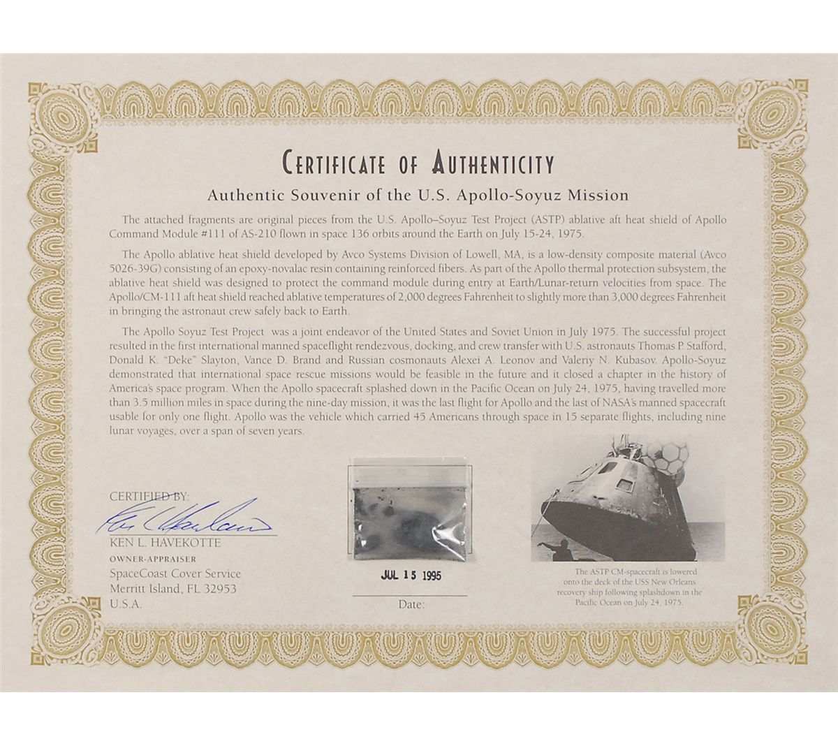 Original flown fragment from the Apollo-Soyuz ablative aft heat shield of the Apollo Command Module #111 which made 136 orbits around earth in July of 1975. Fragment is affixed to an 11 x 8.5 informational certificate of authenticity from Ken Havekotte. In fine condition.