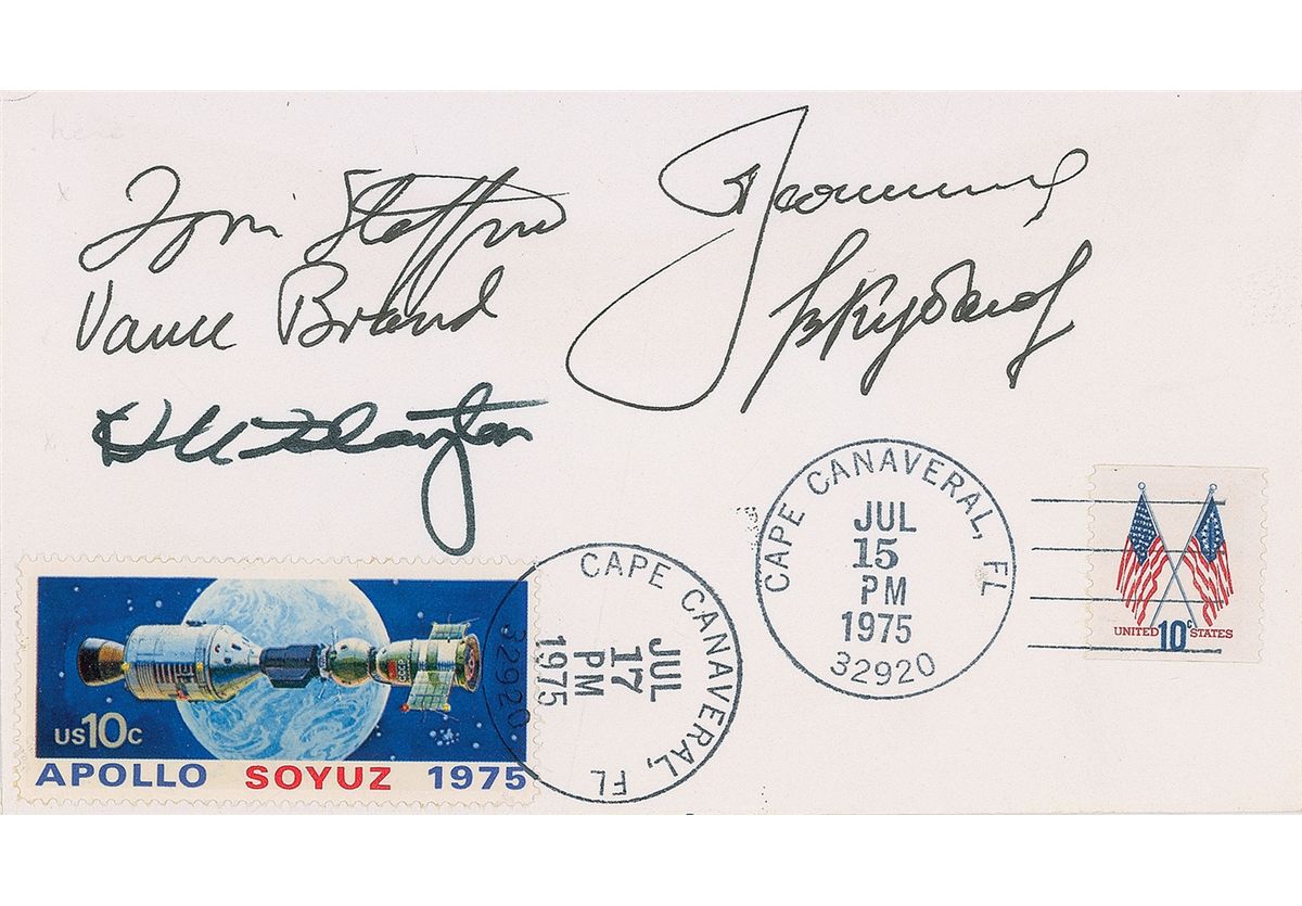 Cover bearing a stamp honoring the Apollo-Soyuz mission, signed in black felt tip by Deke Slayton, Vance Brand, Tom Stafford, Alexei Leonov, and Valeri Kubasov. In fine condition.
