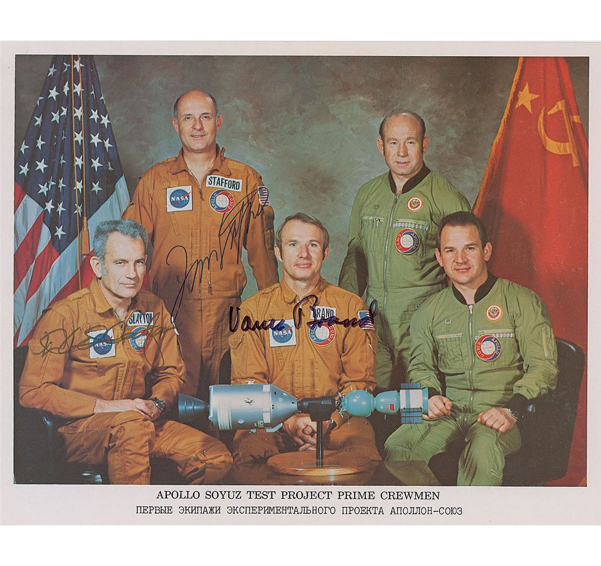 Official color 8 x 10 NASA lithograph of the prime crew of the Apollo-Soyuz project, signed in black felt tip by Deke Slayton, Tom Stafford, and Vance Brand. In fine condition, with Slayton’s signature a couple of shades light.
