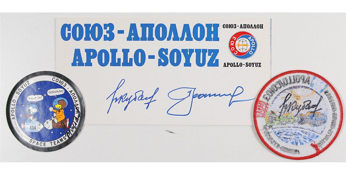 Three items from the collection of Valeri Kubosov: an Apollo-Soyuz brochure in Cyrillic, signed on the front on blue felt tip by Kubosov and Alexei Leonov; a 4? diameter ASTP embroidered mission patch, signed on the reverse in black felt tip by Kubosov; and a 3.5? diameter ASTP Snoopy decal, signed in black felt tip by Kubosov. In fine condition.