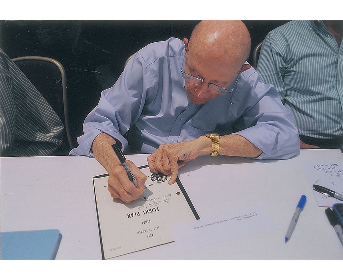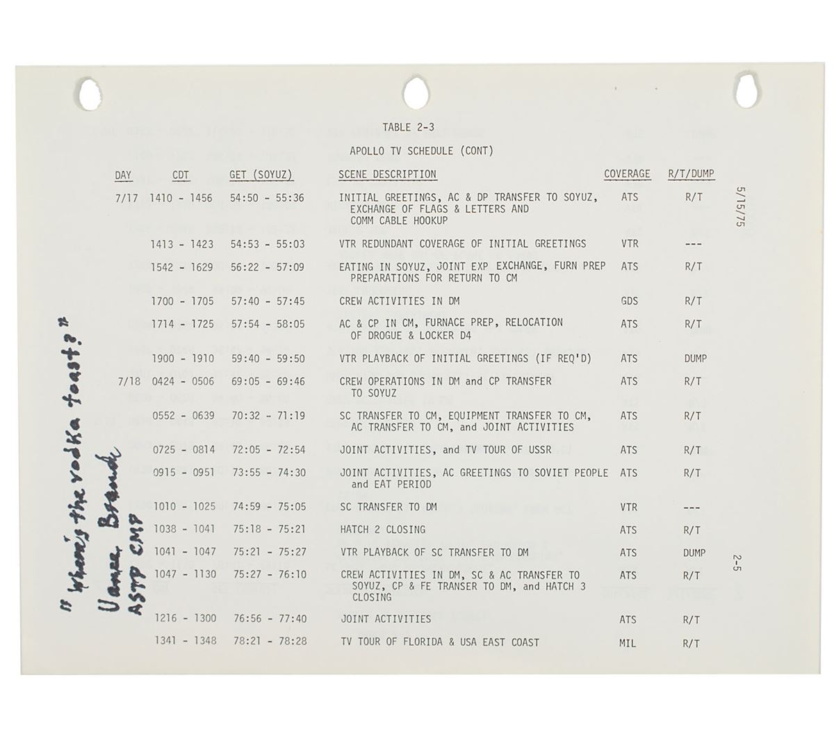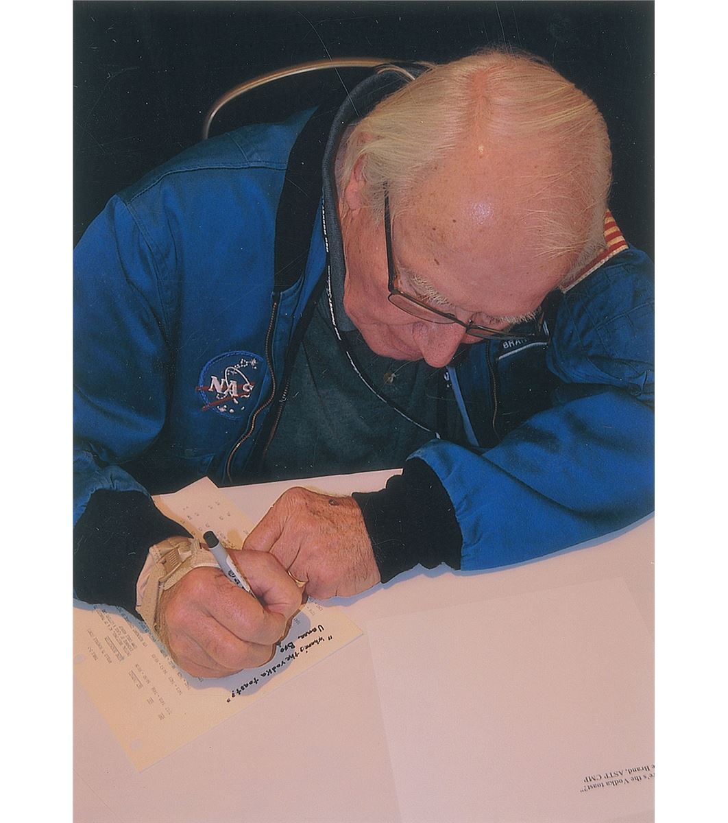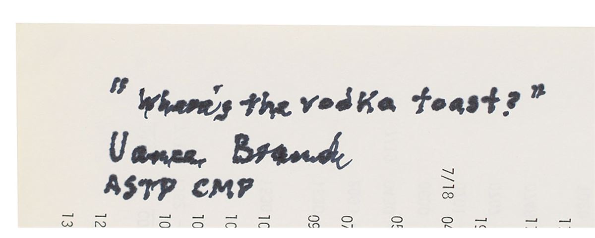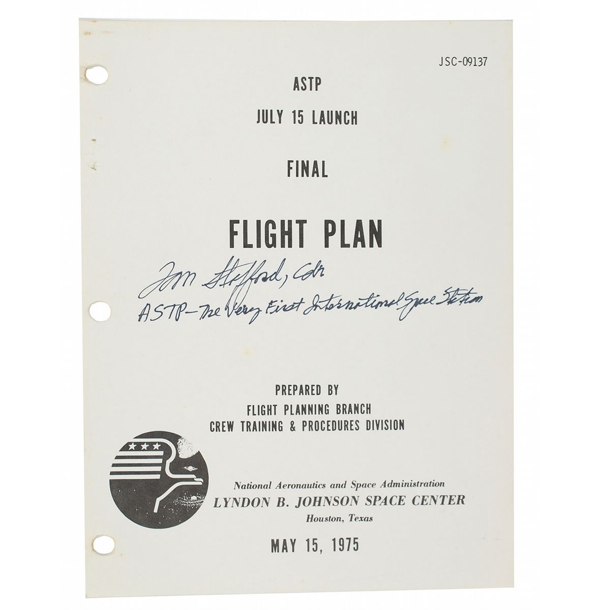 Unbound printed ASTP final flight plan prepared by the Johnson Space Center, 8 x 10.5, dated May 15, 1975, signed on the front cover in black felt tip, “Tom Stafford, Cdr., ASTP—The very first International Space Station.” Brand has humorously signed inside on page 2-5 in black felt tip, “‘Where’s the vodka toast?’ Vance Brand, ASTP CMP.” Housed in a modern binder. In fine condition, with small tears to a few of the binding holes on the left side. Accompanied by photos of both Stafford and Brand taken at the time of signing.