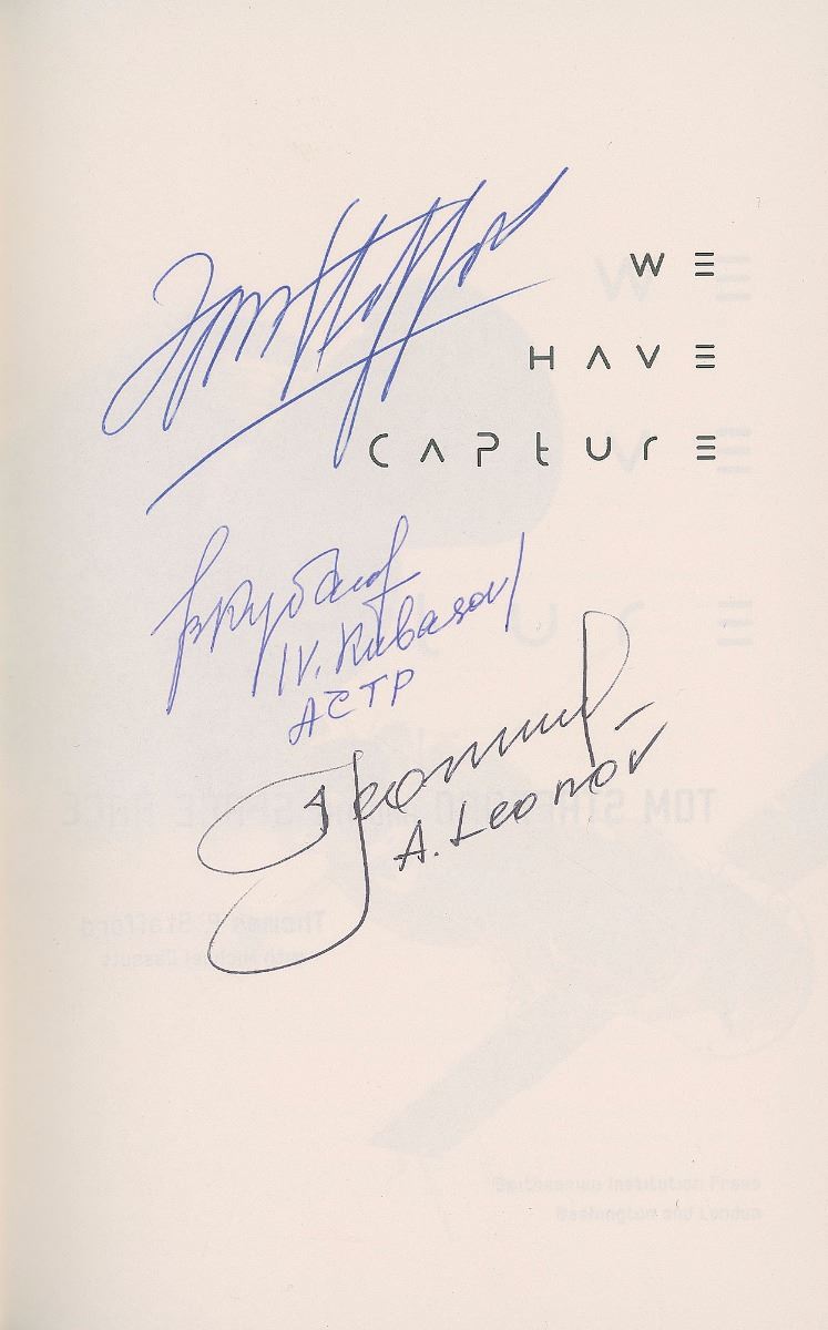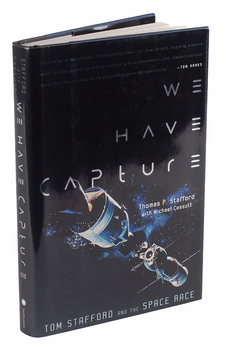 Signed book: We Have Capture. First edition. Washington, DC: Smithsonian Institution Press, 2002. Hardcover with dust jacket, 6.25 x 9.25, 288 pages. Signed on the half-title page in blue and black ballpoint by Tom Stafford, Alexei Leonov, and Valeri Kubasov. Consignor notes that the Stafford signature was obtained in person at a 2002 book signing at the Air and Space Museum, and the Leonov and Kubasov were obtained in person at a UACC Show on September 4, 2004. In fine condition. Accompanied by a photo taken at the time of Stafford’s signing.