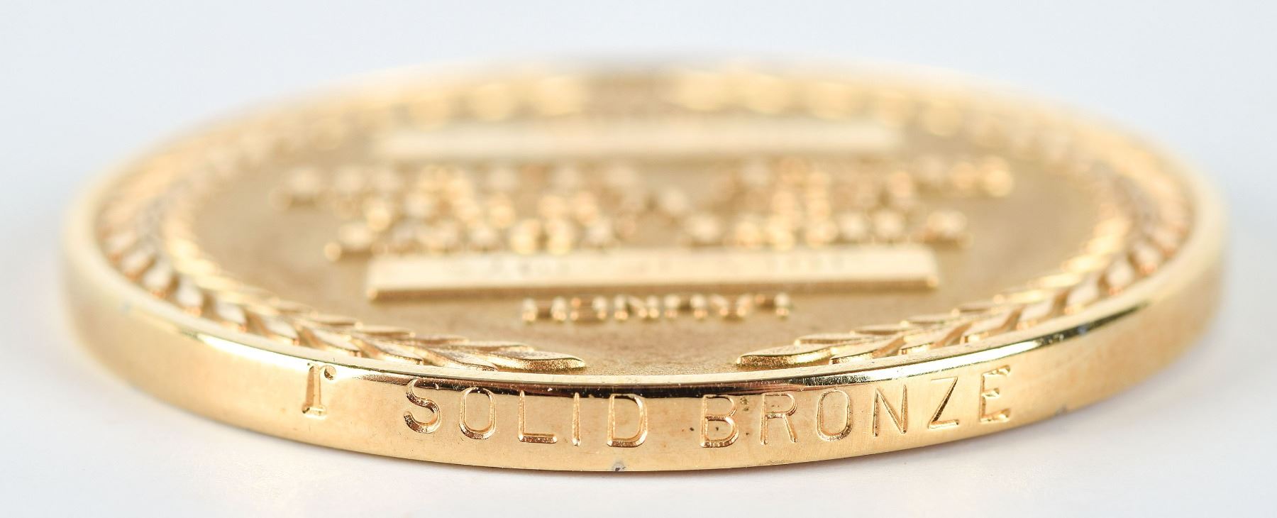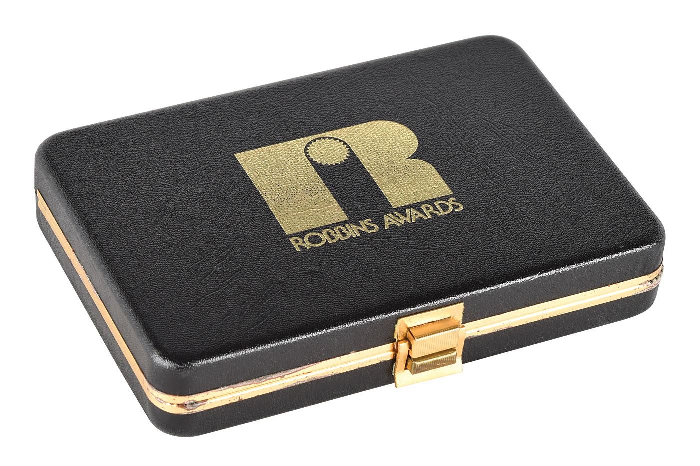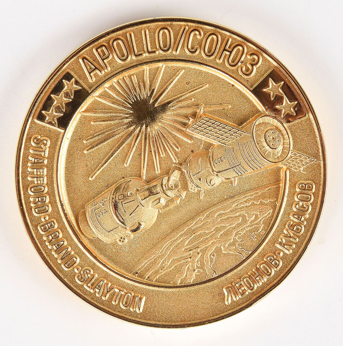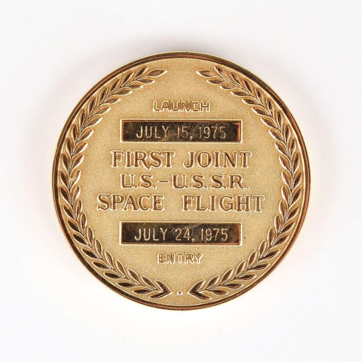 Highly unusual unflown bronze Apollo-Soyuz Test Project Robbins medallion, possibly a prototype, approximately 1.25? in diameter, featuring a raised design of the mission insignia on the face, which features the mission and astronauts' names in both English and Cyrillic. The reverse is engraved with the launch and entry dates, with raised text reading, "First Joint U.S.–U.S.S.R. Space Flight." The medallion lacks a serial number, but features the Robbins Company hallmark and "Solid Bronze" engraved on the edge. Condition is mint state. Accompanied by a hinged "Robbins Awards" case, measuring 6? x 4? x 1?. From the collection of a former Robbins Company executive.