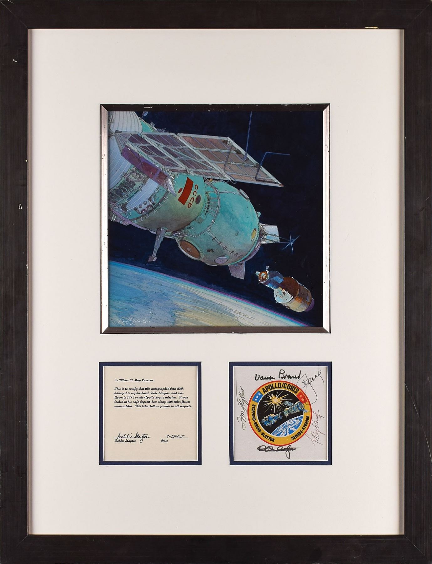 Deke Slayton's flown 5 x 5 swatch of Beta cloth featuring the ASTP mission insignia, carried aboard the Apollo CSM-111 for nine days in space, signed in black ink or felt tip by Deke Slayton, Tom Stafford, Vance Brand, Alexei Leonov, and Valery Kubasov. Double-matted and framed to an overall size of 23.25 x 30.25; the matted display also features a gorgeous original painting by artist Mark Schuler of the moment before the Apollo and Soyuz docking, as well as a certificate of authenticity signed by Bobbie Slayton, the wife of Deke Slayton, which reads, in part: "This is to certify that this autographed beta cloth belonged to my husband, Deke Slayton, and was flown in 1975 on the Apollo Soyuz mission. It was locked in his safe deposit box along with other flown memorabilia. This beta cloth is genuine in all respects." In fine condition, with some surface damage to the right side of the mat, which does not affect any of the matted items.