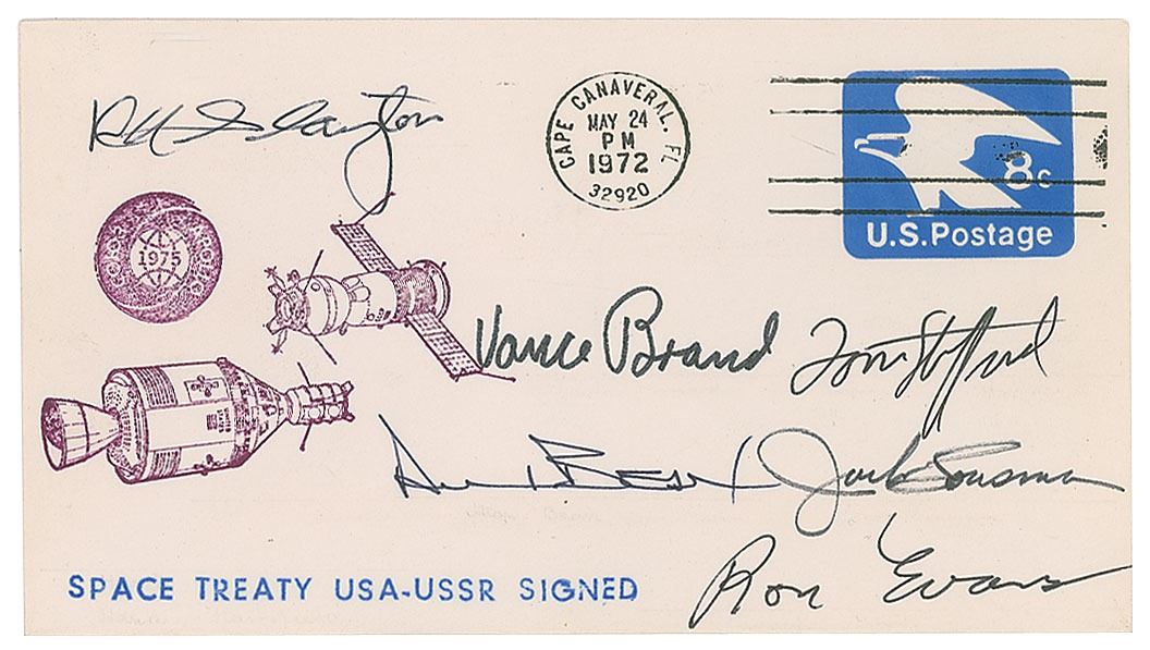 Commemorative cover with a stamped cachet honoring the signing of the US–USSR Space Treaty by which an Apollo spacecraft would dock with a Soyuz laboratory, signed in black ink by the American prime crew of Tom Stafford, Vance Brand, and Deke Slayton, and the backup crew of Alan Bean, Jack Lousma, and Ron Evans. In fine condition.