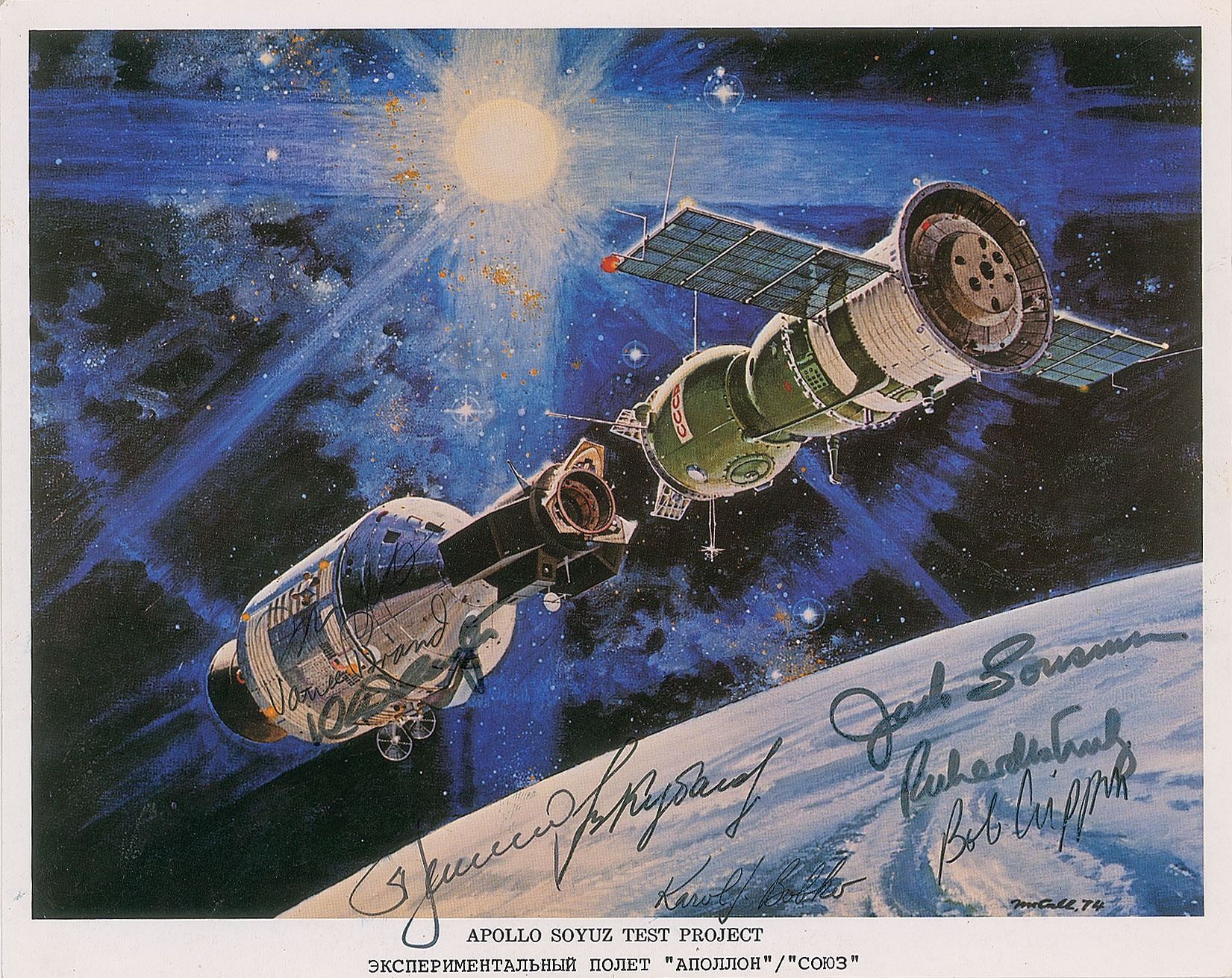 Official color 10 x 8 NASA lithograph of the docking of the Apollo-Soyuz spacecraft, signed in black felt tip by the cooperative prime crew of Alexei Leonov, Valeri Kubasov, Tom Stafford, Vance Brand, and Deke Slayton, as well as backup/support crew members Jack Lousma, Karol J. Bobko, Richard Truly, and Bob Crippen. In fine condition, with a light crease to the upper right corner tip.