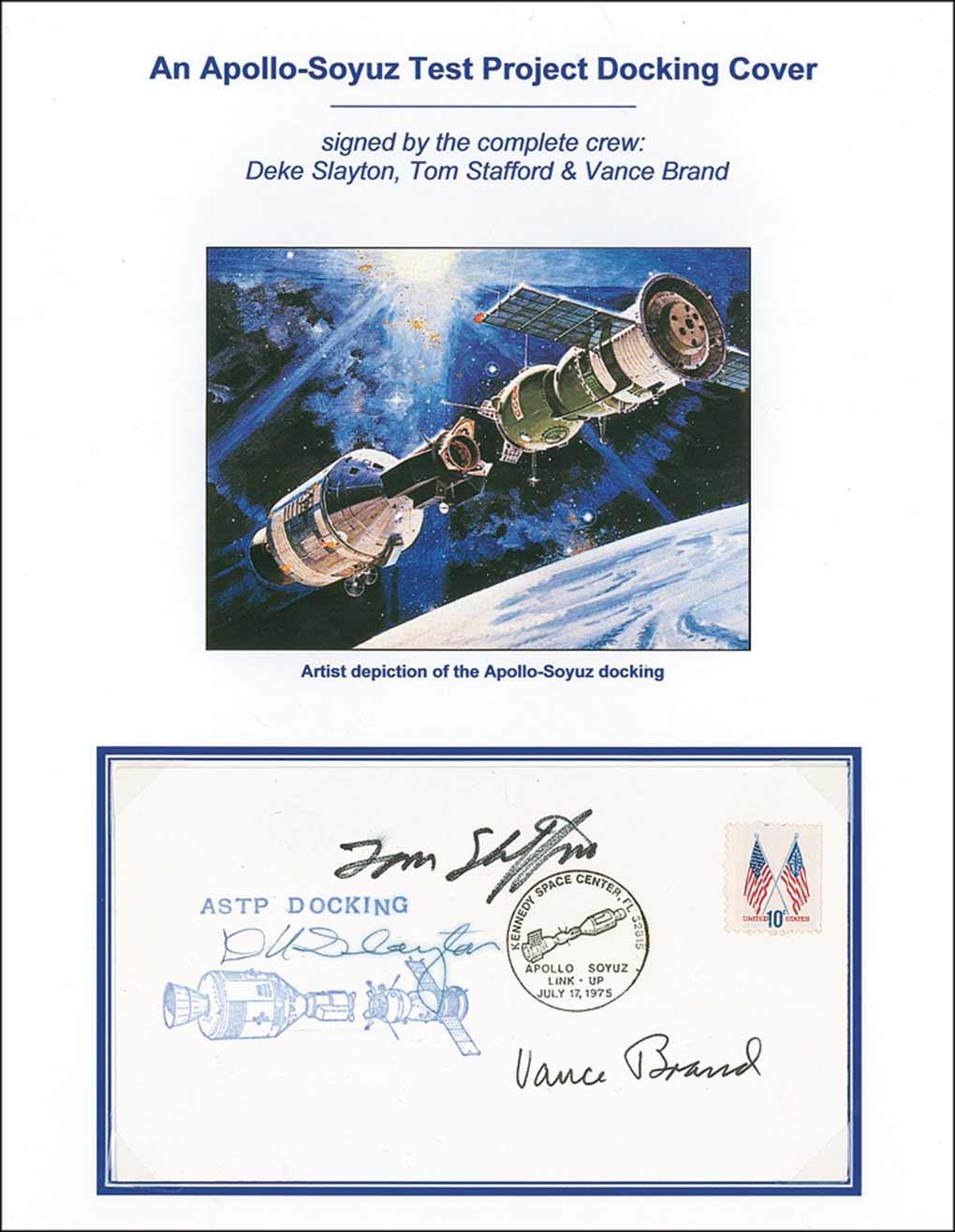 Postal cover with a cachet honoring the mission, signed on the front in felt tip and ink by Vance Brand, Tom Stafford, and Deke Slayton. Removably presented on a color 8.5 x 11 informational sheet. In fine condition, with a slightly fuzzy appearance to Slayton’s signature.