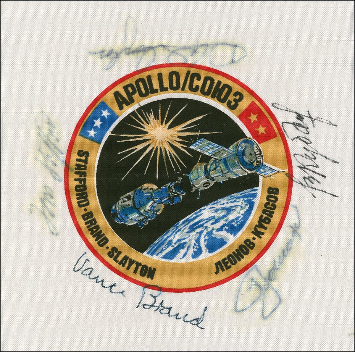 Apollo-Soyuz test mission beta cloth, 5.5 x 5.5, signed around the outside of the mission emblem in ink and felt tip by crew members Tom Stafford, Vance Brand, Deke Slayton, Alexei Leonov. Accompanied by a letter of provenance from Bobbie Slayton, wife of Deke Slayton, attesting to the patch. Mild haloing and fading to Slayton, Stafford, and Leonov’s signatures, which still remain completely legible, otherwise fine condition. Pre-certified Scott Cornish and RRAuction COA.