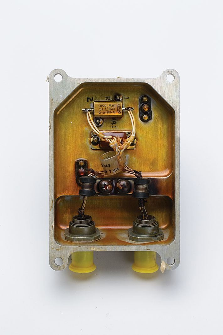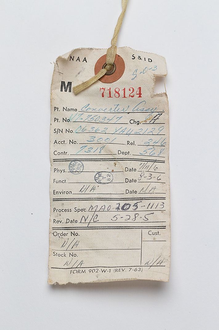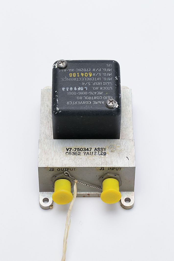 Apollo Spacecraft DC Power Convertor, measuring 3.5? x 5.5? x 3?, featuring several stenciled part numbers and an attached NAA S&ID tag, reading: "Pt. Name Converter Assy., Pt. No. V7-750347 Chg. A, S/N No. 06362YAU2129, Acct. No. 3001 Rel. 246, Contr. 7318 Dept. 568." In fine condition.