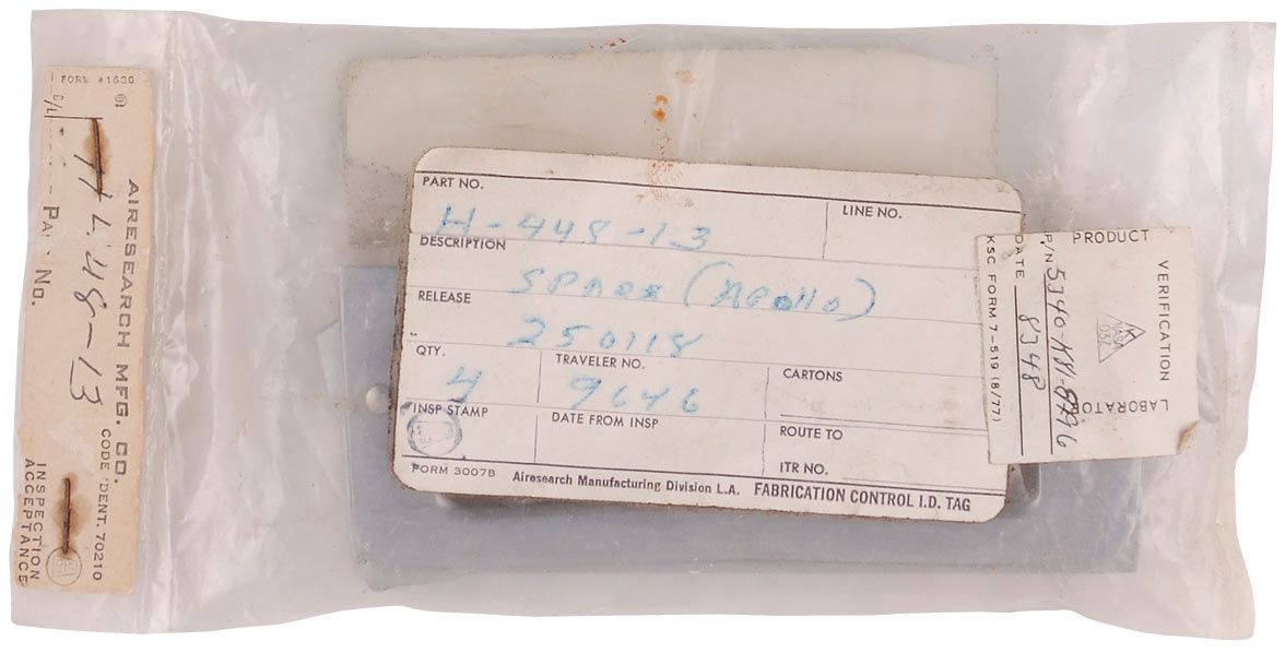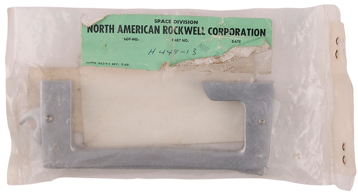 Spare Apollo C-shaped handle, 5.5 x 2, by North American Rockwell Corporation. Handle features a release at the top, which releases a central lever, which locks when fully extended. Handle is contained in its sealed plastic bag, bearing a Rockwell label on one side, and a parts label on the other side which reads, “Part No. H–448–13, Spare (Apollo),” with an inspector’s stamp at bottom, and an Airesearch Mfg. label at top.