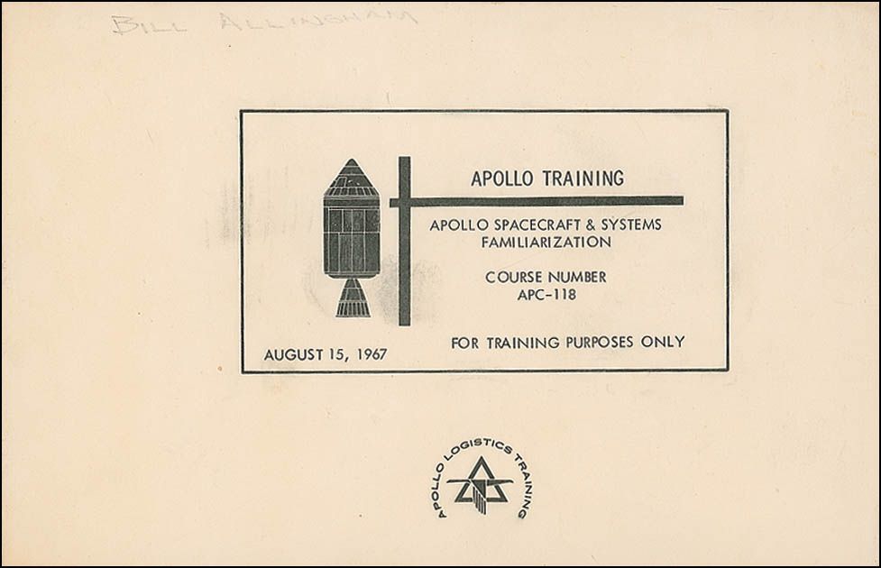 Original Apollo Spacecraft & Systems Familiarization Manual, course number APC-118, 8.5 x 5.5, August 15, 1967, featuring extensive technical diagrams of various spacecraft systems. Light scattered toning and soiling to the covers, a pencil notation to the upper border of the front cover, and a few pencil notes and notations to the diagrams inside, otherwise fine condition.