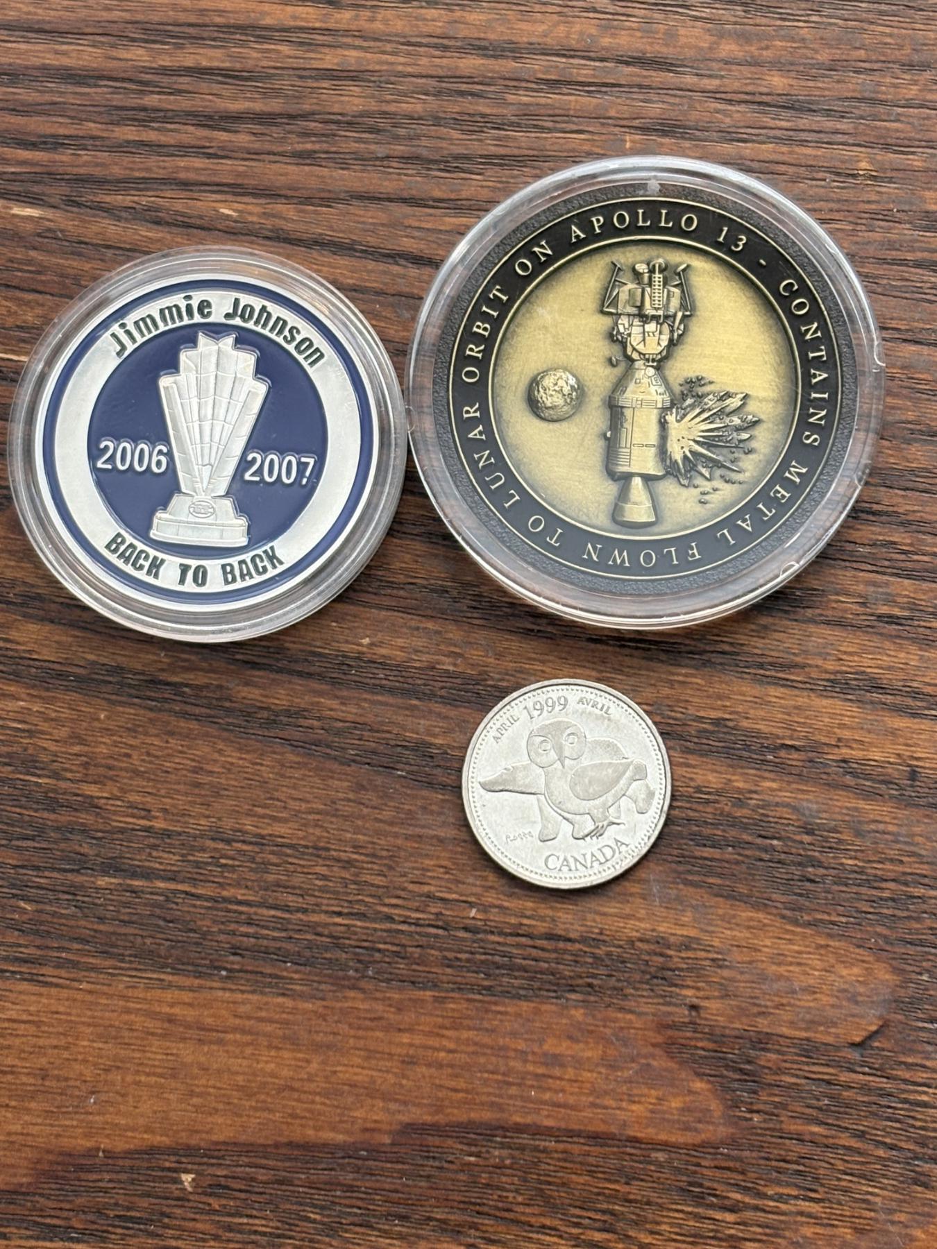 Apollo XIII Coin - Lowe's Racing Coin - Canada 25 Cent Coin - Apollo Houston We've Had a Problem - April 11th- 17th 1970 - Orbit on Apollo 13 - Jimmie Johnson Lowe's Back to Back 2006-2007 - 1999 April Canada Coin