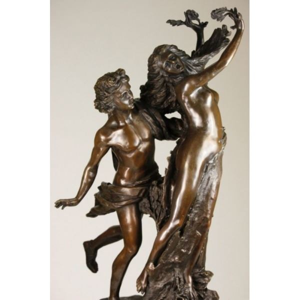 Apollo and Daphne This famous sculpture is by the famous Italian sculptor, Giovanni Lorenzo Bernini (1598-1680). It was inspired by one of the stories included in Ovid's Metamorphoses. The Story Behind the Sculpture: In the story, Apollo, god of prophecy, sees the young Eros, god of love, playing with his bow and arrows and remarks. In retribution for this reproach, Eros wounds Apollo with a golden arrow, causing him to fall in love with the nymph daughter of the river God, Peneus. Eros additionally wounds the beautiful nymph, Daphne, with a lead arrow, thus insuring she would not be wooed by Apollo's advances. (In fact, the arrow's power was so strong that Daphne forthwith refused all of her lovers.) Apollo, struck with the golden arrow of love, pleads with Daphne to fulfill his desire. Daphne, repulsed by the idea, begins to flee. Even as she runs, he is more captivated by her beauty. Apollo grows impatient and soon, sped by Eros, gains on her. With slower speed and failing strength, Daphne cries out to her father just as Apollo captures her. Not a moment later, Daphne's skin turns to bark, her hair leaves, her arms branches, her feet roots, and her face a treetop. In only a moment, Peneus protects his daughter by turning her into a laurel tree. After the transformation Apollo still embraces the tree. He cuts off some of her branches and leaves to make a wreath and proclaims the laurel as a sacred tree. Bronze Dimensions with Marble Base: Height 23 X Width 20 inches. Weight: 40 LBS. Inventory: 69-190B43096