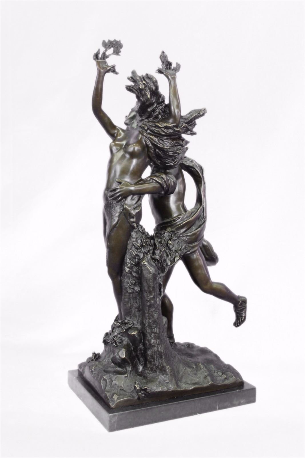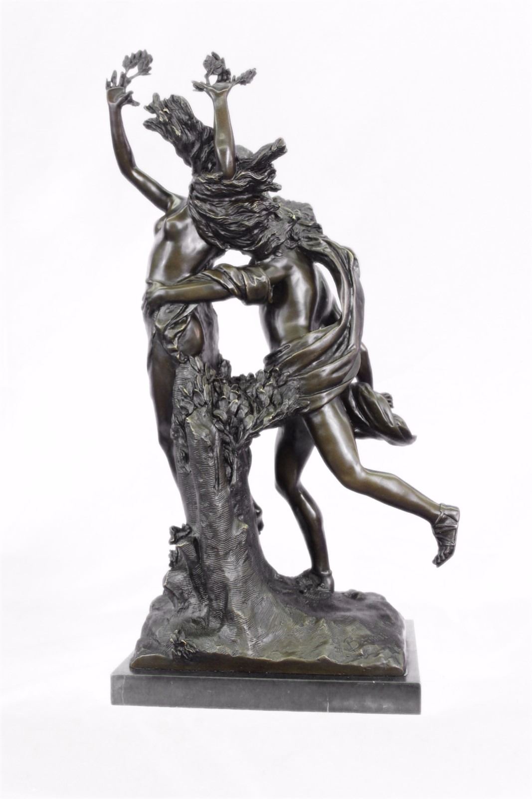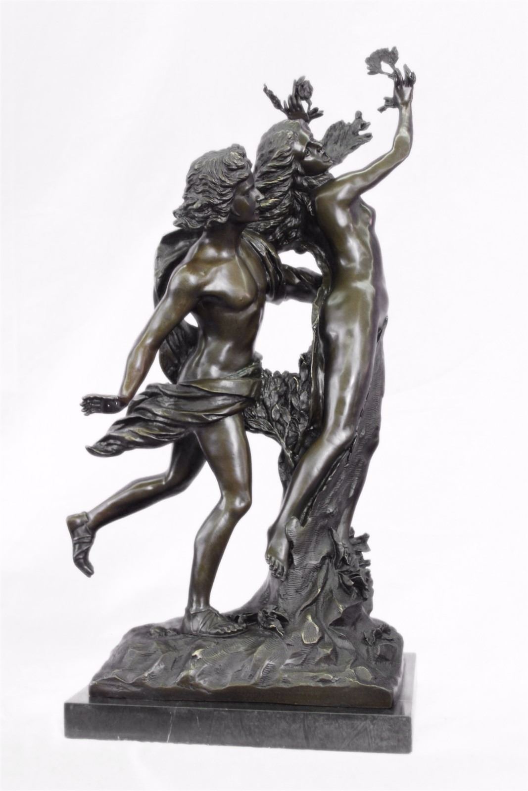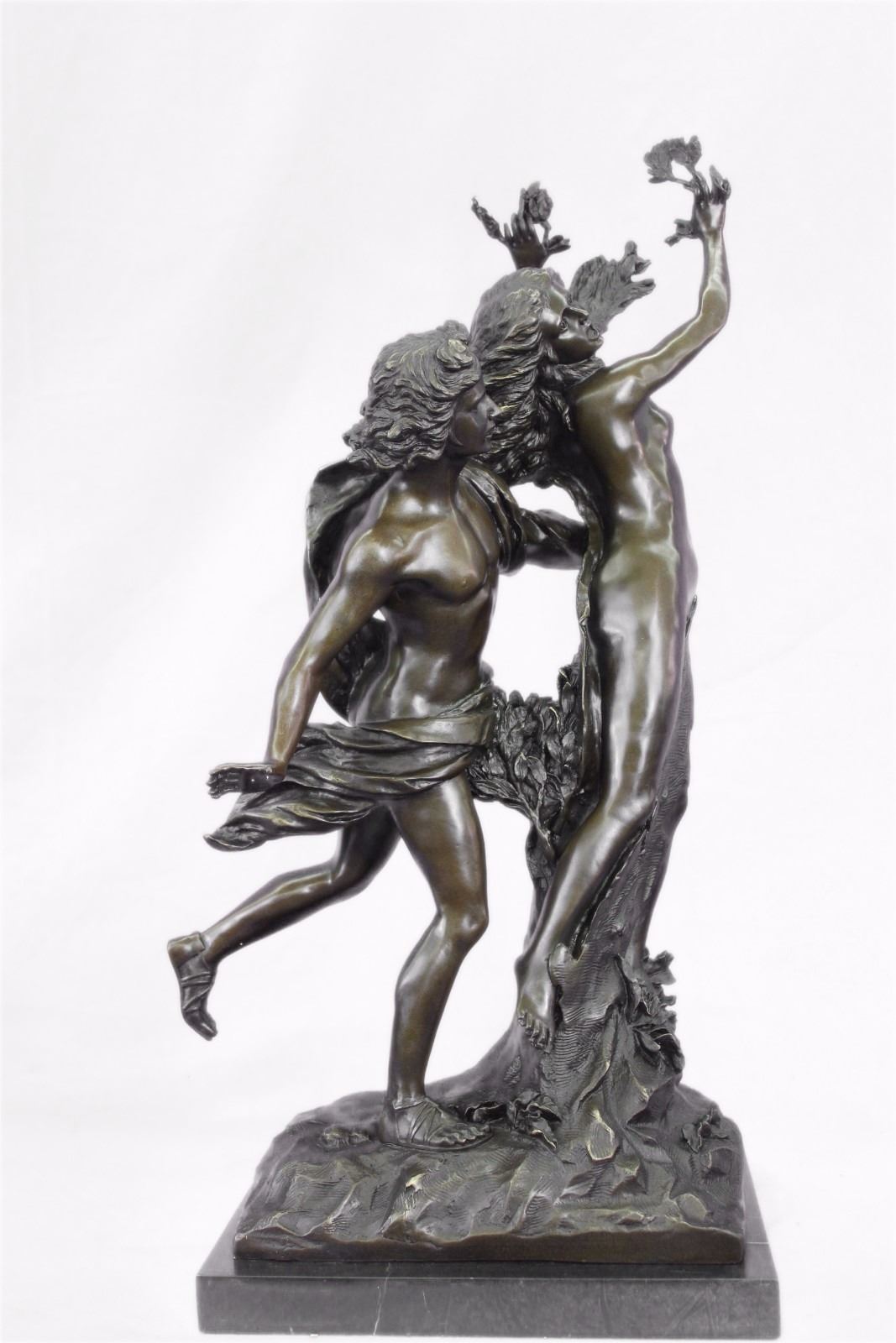 Apollo and Daphne This famous sculpture is by the famous Italian sculptor, Giovanni Lorenzo Bernini (15981680). It was inspired by one of the stories included in Ovid's Metamorphoses. The Story Behind the Sculpture: In the story, Apollo, god of prophecy, sees the young Eros, god of love, playing with his bow and arrows and remarks. In retribution for this reproach, Eros wounds Apollo with a golden arrow, causing him to fall in love with the nymph daughter of the river God, Peneus. Eros additionally wounds the beautiful nymph, Daphne, with a lead arrow, thus insuring she would not be wooed by Apollo's advances. (In fact, the arrow's power was so strong that Daphne forthwith refused all of her lovers.) Apollo, struck with the golden arrow of love, pleads with Daphne to fulfill his desire. Daphne, repulsed by the idea, begins to flee. Even as she runs, he is more captivated by her beauty. Apollo grows impatient and soon, sped by Eros, gains on her. With slower speed and failing strength, Daphne cries out to her father just as Apollo captures her. Not a moment later, Daphne's skin turns to bark, her hair leaves, her arms branches, her feet roots, and her face a treetop. In only a moment, Peneus protects his daughter by turning her into a laurel tree. After the transformation Apollo still embraces the tree. He cuts off some of her branches and leaves to make a wreath and proclaims the laurel as a sacred tree. Bronze Dimensions with Marble Base: Height 23 X Width 20 inches. Weight: 40 LBS. Inventory: 69190B43096