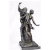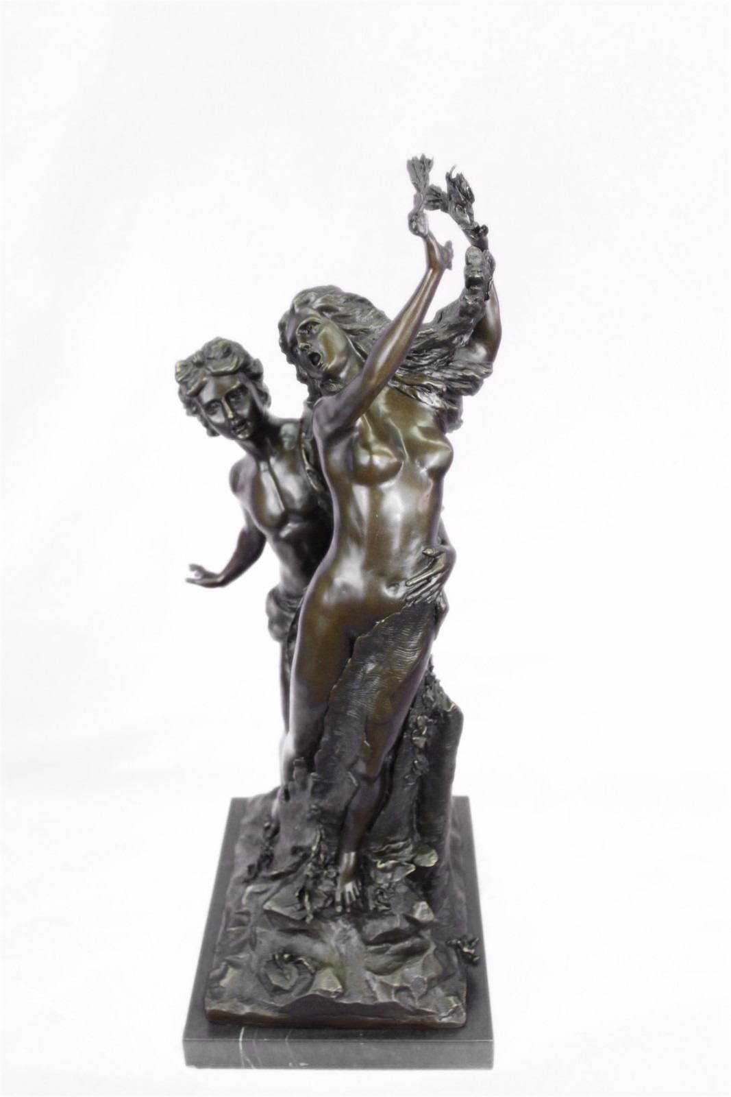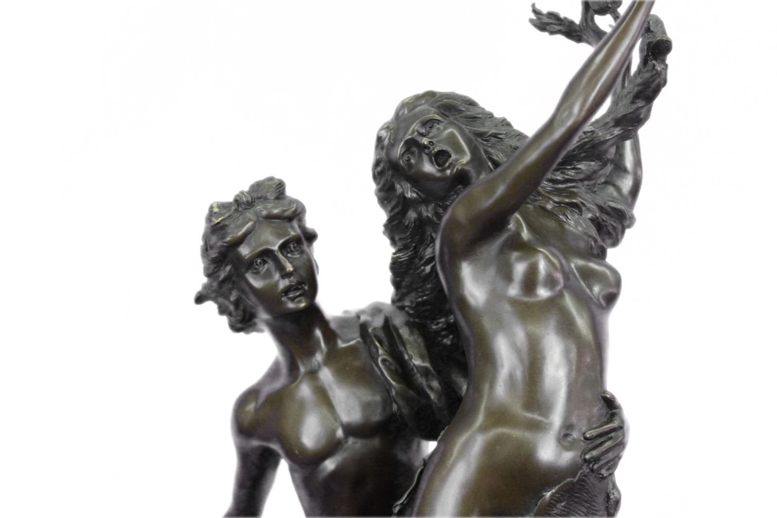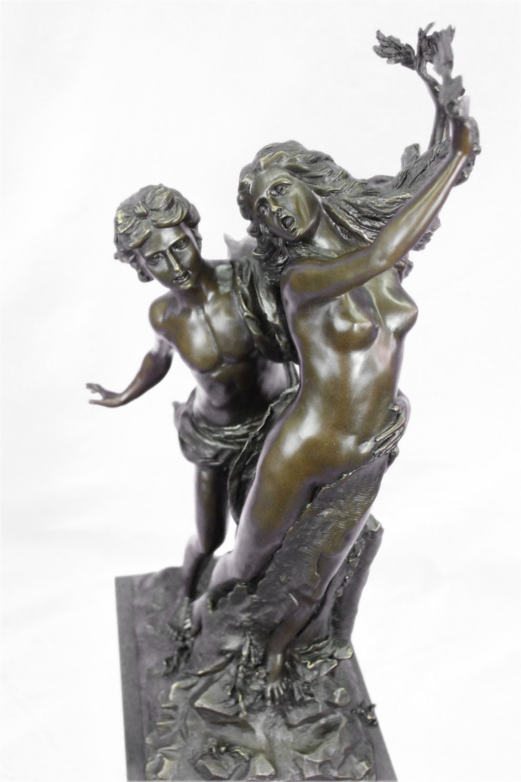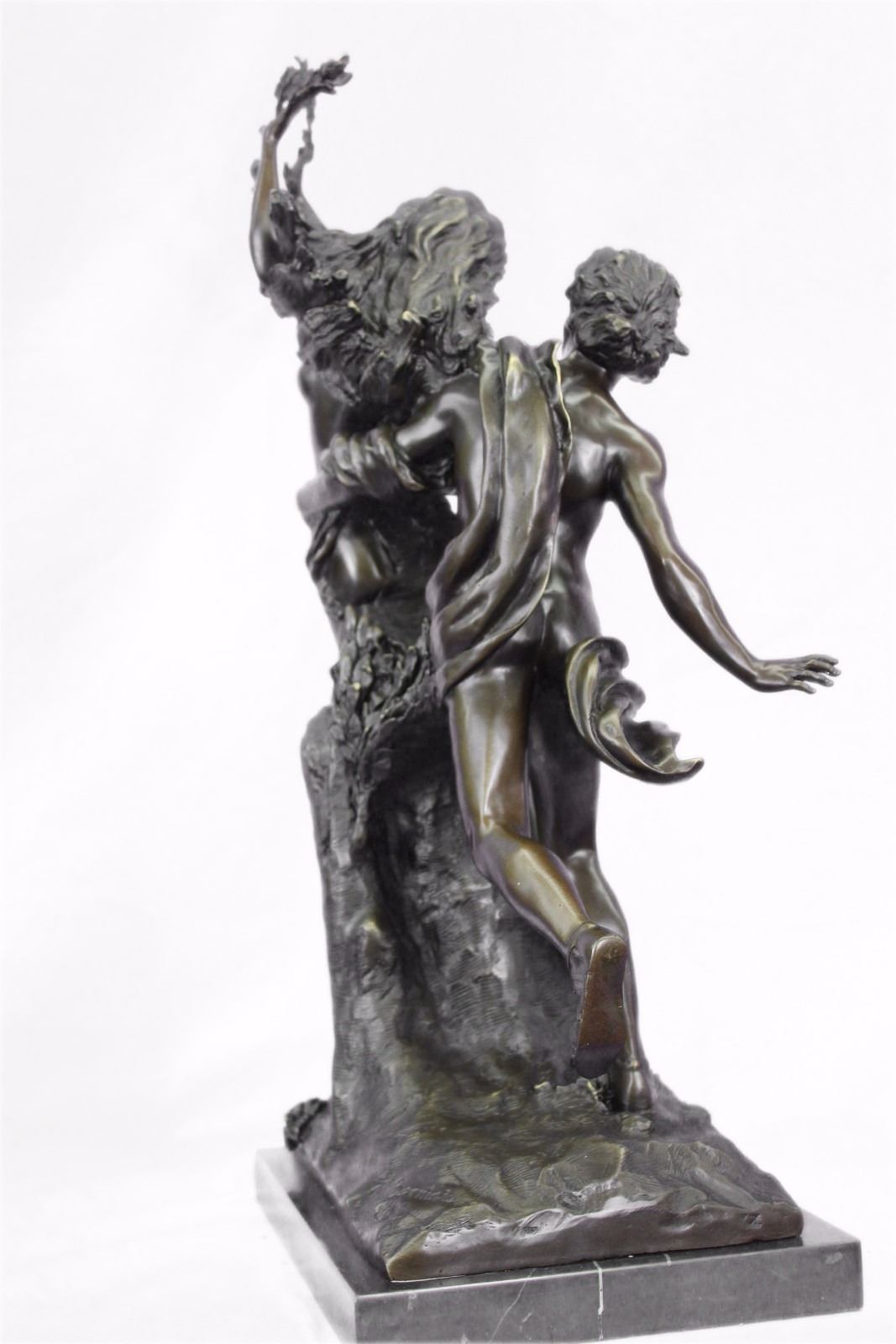 Apollo and Daphne This famous sculpture is by the famous Italian sculptor, Giovanni Lorenzo Bernini (15981680). It was inspired by one of the stories included in Ovid's Metamorphoses. The Story Behind the Sculpture: In the story, Apollo, god of prophecy, sees the young Eros, god of love, playing with his bow and arrows and remarks. In retribution for this reproach, Eros wounds Apollo with a golden arrow, causing him to fall in love with the nymph daughter of the river God, Peneus. Eros additionally wounds the beautiful nymph, Daphne, with a lead arrow, thus insuring she would not be wooed by Apollo's advances. (In fact, the arrow's power was so strong that Daphne forthwith refused all of her lovers.) Apollo, struck with the golden arrow of love, pleads with Daphne to fulfill his desire. Daphne, repulsed by the idea, begins to flee. Even as she runs, he is more captivated by her beauty. Apollo grows impatient and soon, sped by Eros, gains on her. With slower speed and failing strength, Daphne cries out to her father just as Apollo captures her. Not a moment later, Daphne's skin turns to bark, her hair leaves, her arms branches, her feet roots, and her face a treetop. In only a moment, Peneus protects his daughter by turning her into a laurel tree. After the transformation Apollo still embraces the tree. He cuts off some of her branches and leaves to make a wreath and proclaims the laurel as a sacred tree. Bronze Dimensions with Marble Base: Height 23 X Width 20 inches. Weight: 40 LBS. Inventory: 69190B43096