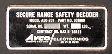 The Secure Range Safety Decoder, 7.25 x 3 x 4, manufactured by Avco Corporation. The Secure Range Safety Command Decoder receives a sequence of tones that are decoded according the wiring of a code plug to initiate vehicle destruction in the case of emergency. The coded sequence is Top Secret prior to launch. The input to the Command Decoder is received from the Secure Range Safety Command Receiver.