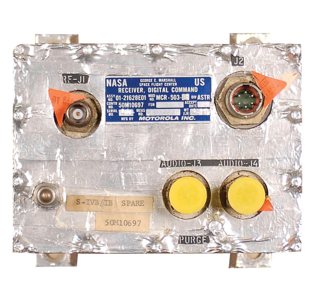 The Digital Command Receiver, 5.5 x 3.5 x 3.5, with its NASA George C. Marshall Space Flight Center label affixed to the top. The Secure Range Safety Command Receiver, was designed to receive a sequence of tones that are used to destruct the vehicle in the case of emergency. The output of the Command Receiver is fed into the Secure Range Safety Command Decoder which looks for the proper sequence of tones.