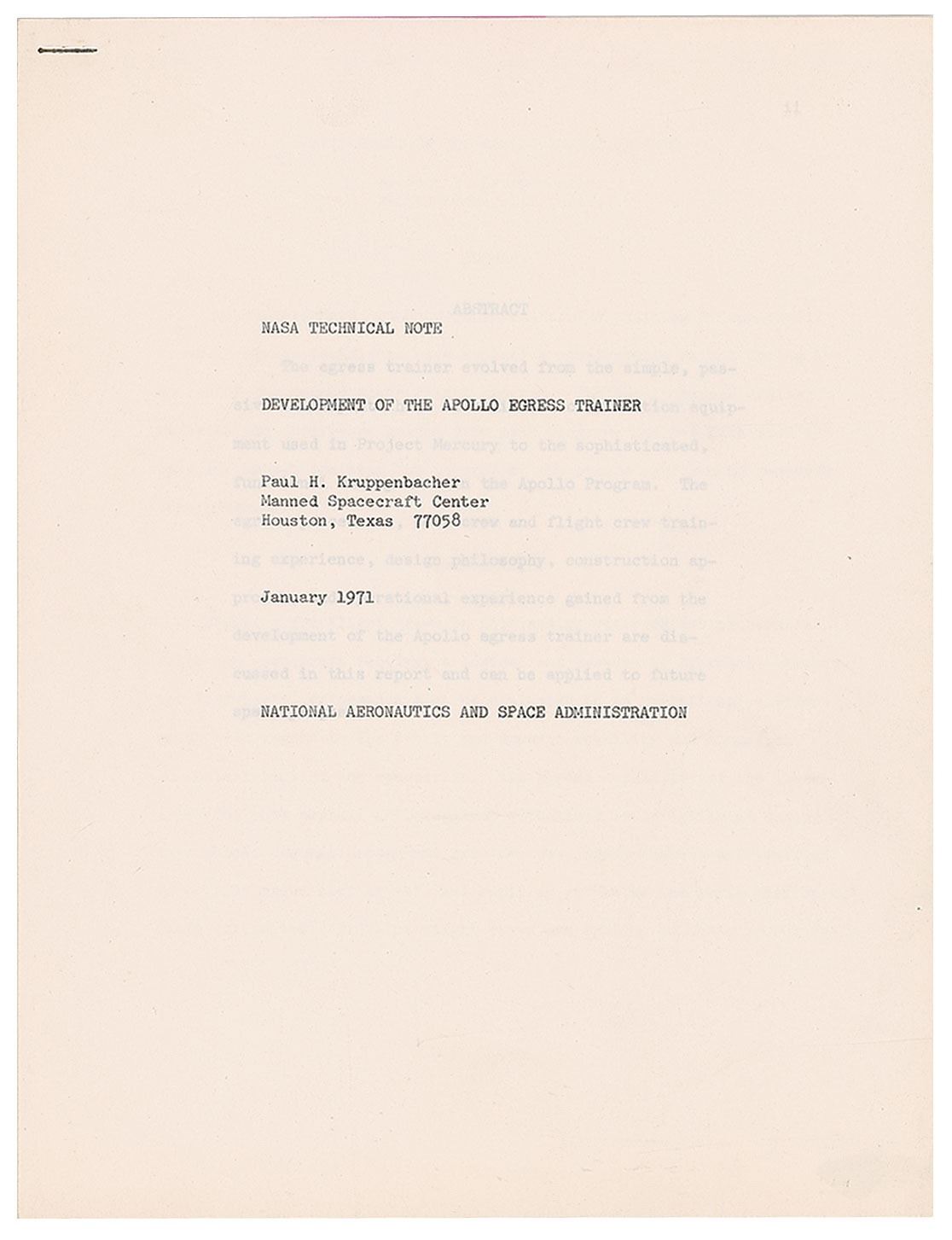A stapled 23-page manual entitled “Development of the Apollo Egress Trainer,” written by Paul H. Kruppenbacher, dated January 1971, with sections related to Design and Construction and Apollo Egress Trainer Applications.