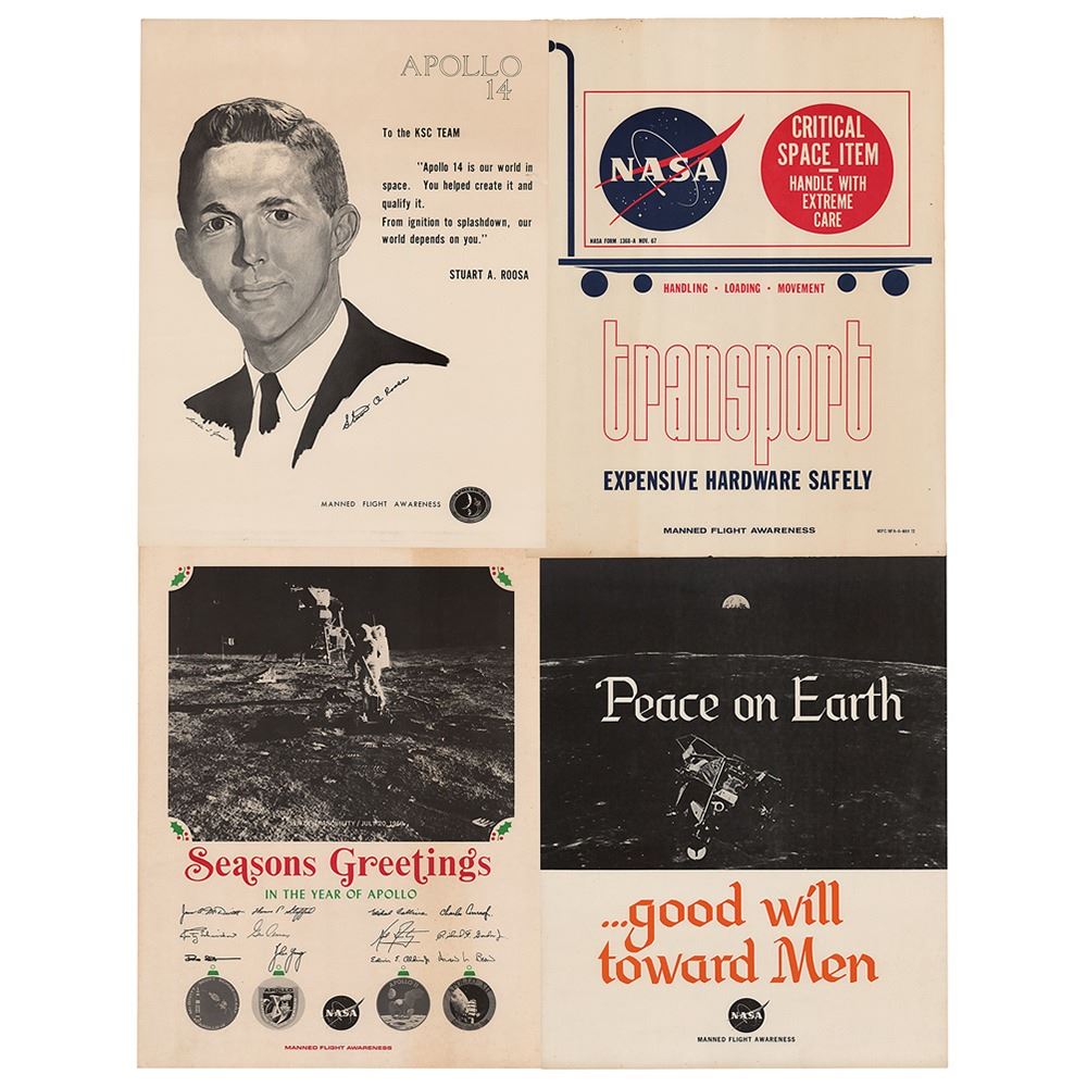 Four original posters produced by NASA‰Ûªs Manned Flight Awareness, 17 x 22 and 17.5 x 22.25, which include the following designs: a large image of Buzz Aldrin at the Sea of Tranquility during the Apollo 11 mission, set above text, ‰ÛÏSeasons Greetings in the Year of Apollo,‰Û and preprinted signatures of the crew of the 1969 Apollo missions; an image of the Apollo 11 LM Eagle rising from the moon with large white and orange text: ‰ÛÏPeace on Earth‰Û_good will toward Men‰Û; an artistic portrait of Apollo 14 CMP Stuart A. Roosa, with preprinted signature below and quote text to the right: ‰ÛÏTo the KSC Team, ‰Û÷Apollo 14 is our world in space. You helped create it and qualify it. From ignition to splashdown, our world depends on you‰Û; and a push cart with a large box bearing a NASA ‰Û÷meatball‰Ûª logo and label marked as ‰ÛÏCritical Space Item, Handle with Extreme Care,‰Û with large text below ‰ÛÏTransport, Expensive Hardware Safely." In overall fine condition, with some light edge creasing, and chipping to top edge of the safety poster.