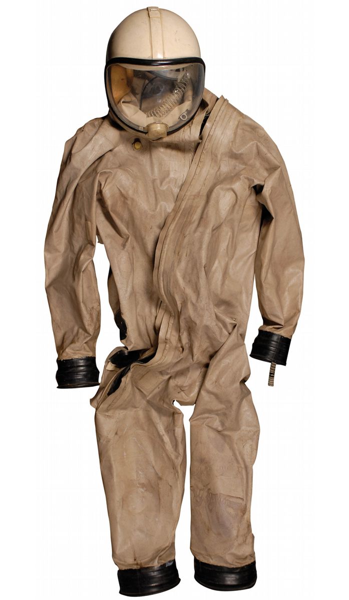 NASA Apollo-era SCAPE suit Toxic Fuel Handler's coveralls. (SCAPE) stands for Self Contained Atmospheric Protective Ensemble and is an original from the Kennedy Space Center. This well-used set of butyl-rubber coveralls with helmet, no gloves or boots, was made to be worn by those who transferred the dangerously volatile and corrosive propellant fuel to and from rockets at the Kennedy Space Center. The inside retains portions of its original springs and hoses. The helmet has the large numbers "613" on both sides. Helmet also retains its NASA/KSC label inside. In good condition, with areas of rubber beginning to deteriorate, scattered wear, scuffing, and soiling, and non-functioning zipper. This genuine NASA Apollo-era SCAPE suit is an interesting addition to any Space collection. The suit retains the original "NASA property" metal tag and identification numbers.