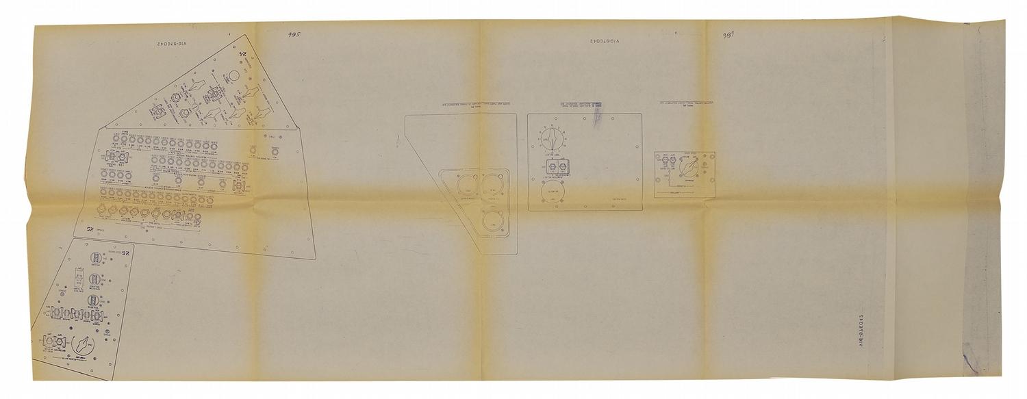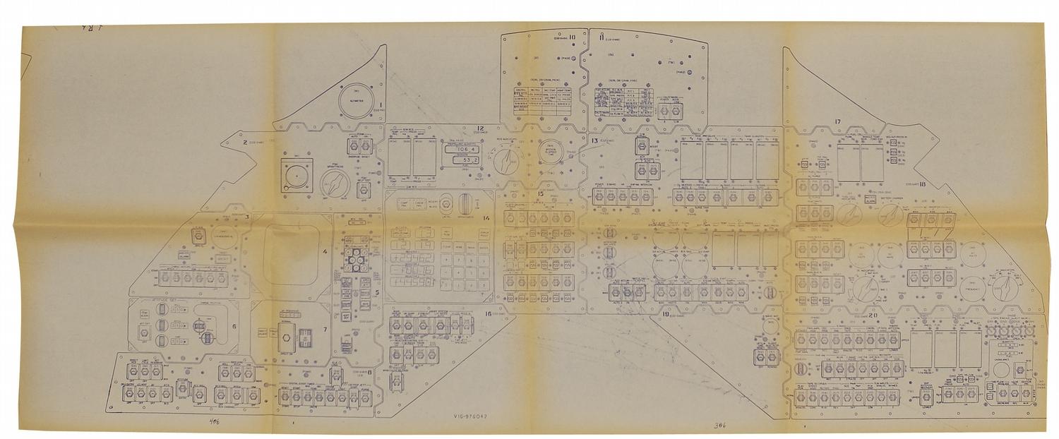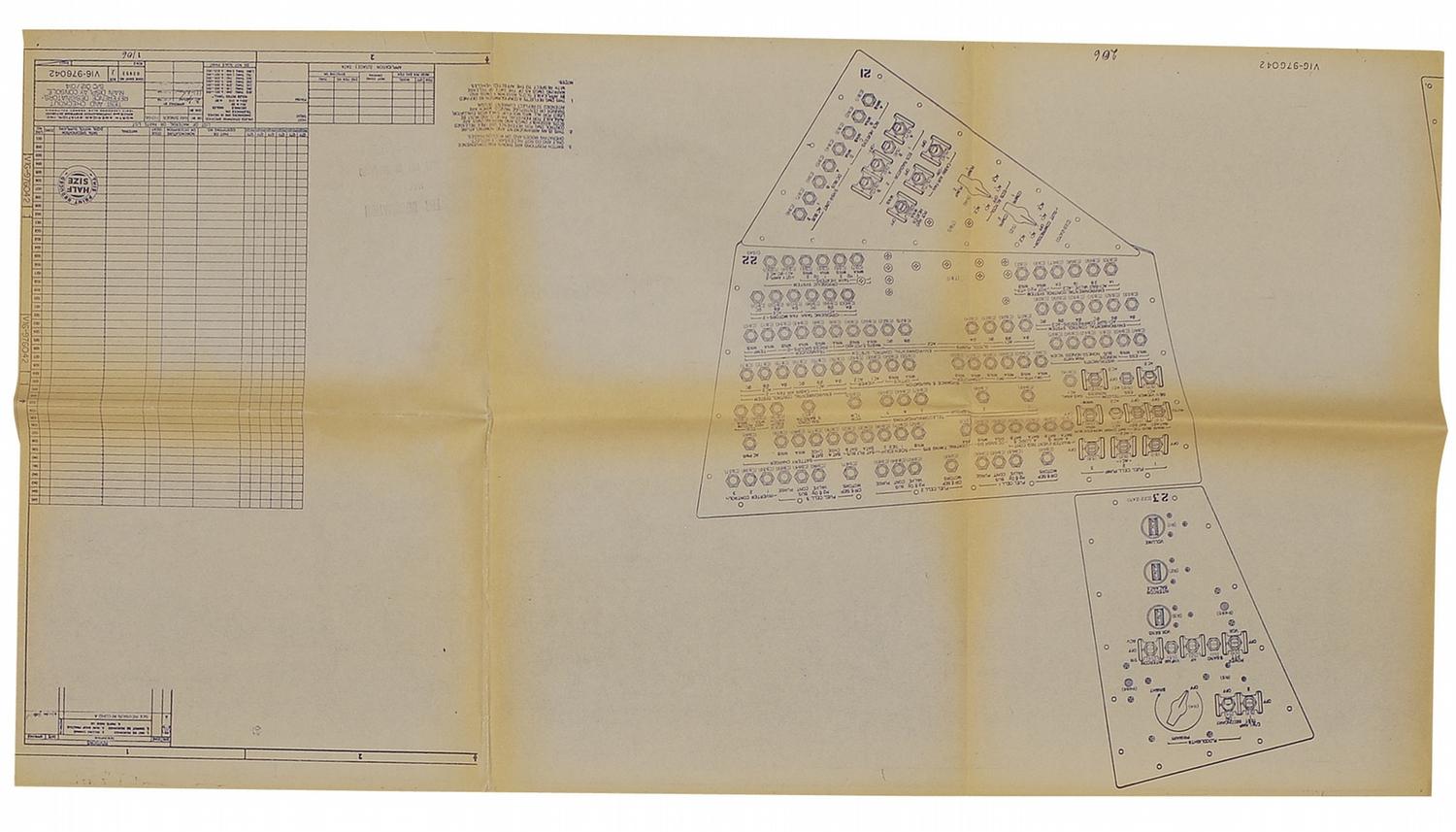 Remarkable blueprint of an Apollo command module, measuring a colossal 127.5 x 18, revealing four sections of the maze of dials and switches that comprised the main display console. Sections marked include the “clock and timer panel” and the “forward lefthand equipment bar.” The lengthy sheet is also stamped “For Information May 16 Will Not Be Replaced.” In fine condition, with moderate yellowing and a few areas of paper separation along the intersecting folds.