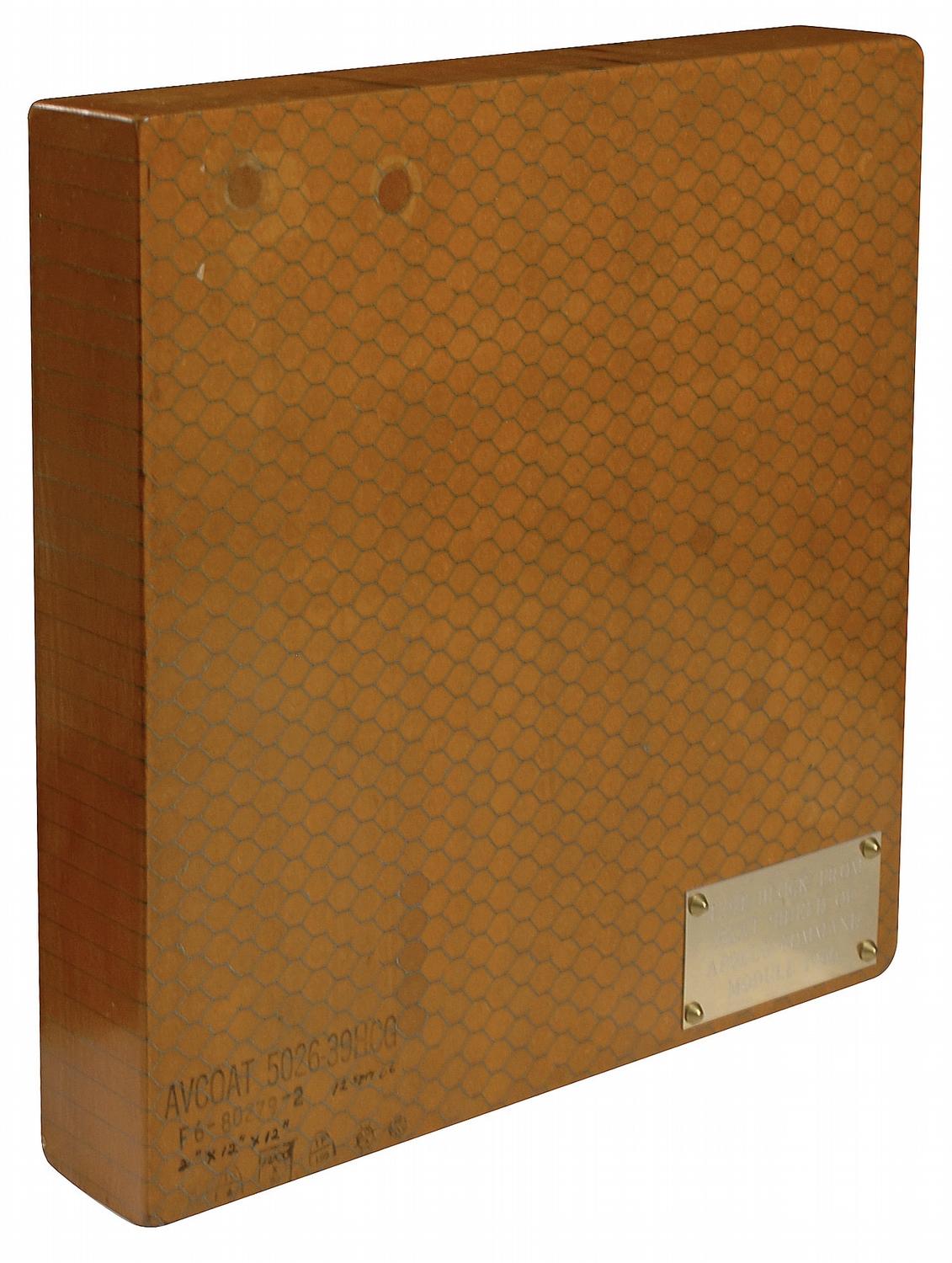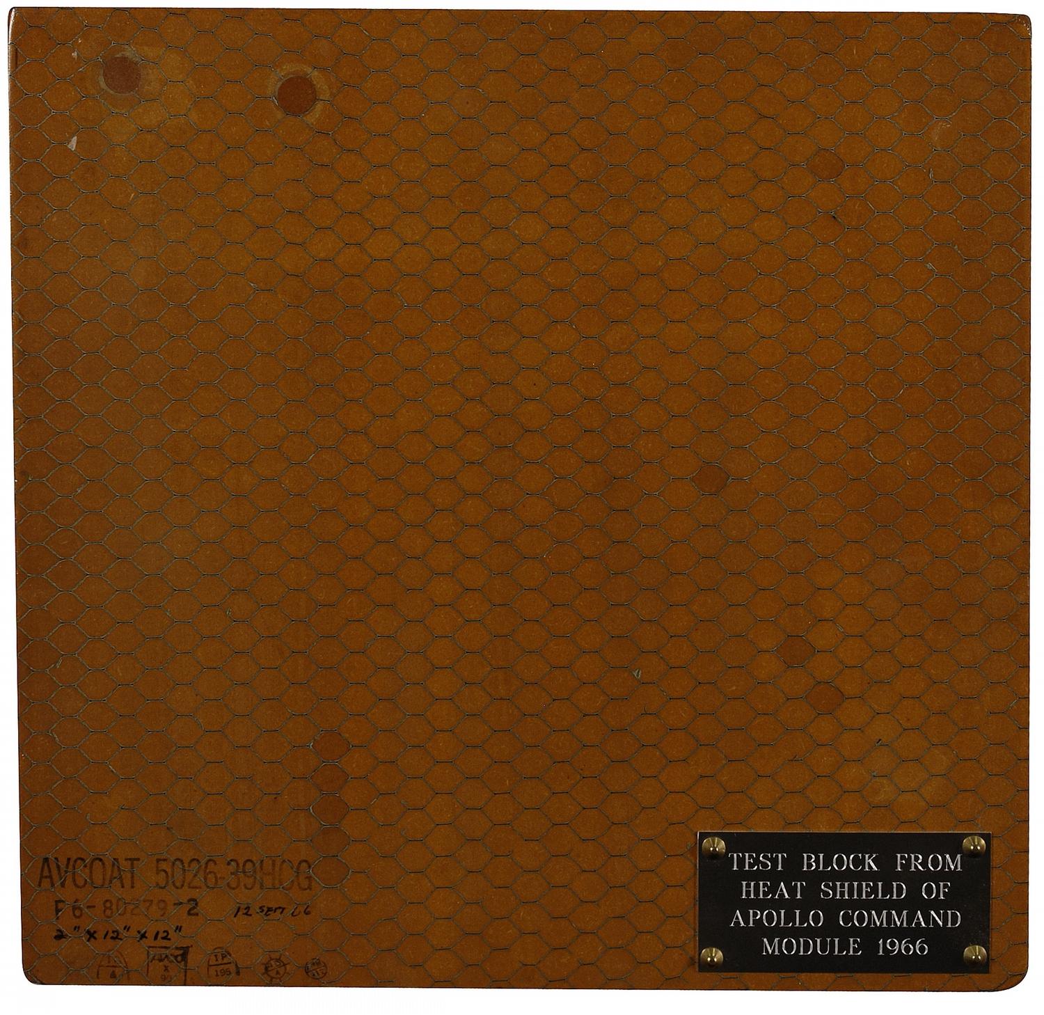 Huge 12 x 12 x 2 heat shield test block of the Apollo Command Module from 1966. The block weighs 5.75 pounds and is stamped in the lower left “AVCOAT 5026-39HCG,” the company name and stock number, with five stamps along the bottom edge, which appear similar to proof marks. Affixed to the lower right corner of the block is a 3.5 x 2 plaque which reads, “Test block from heat shield of Apollo Command Module 1966.” AVCOAT was produced by AVCO corporation, with integration into the Command Module's Thermal Protection System by North American Aviation. These heat shields were designed to withstand temperatures in excess of 3200°C. Accompanied by a photocopied Skyline booklet, dated 1966, issued by North American Aviation, Inc., that shows the construction of the heat shield, how it was developed and tested, and more. While samples of Apollo heat shields have been offered in the past, usually paperweight size, this is the largest example we have seen offered.