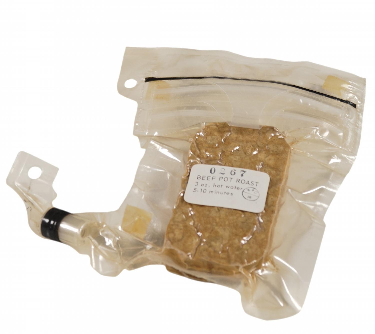 Amazingly unappetizing but wholly unique freeze-dried ‘moon food.’ This particular example, labeled “Beef Pot Roast,” measures 2 x 3.5 x .75 and rests within a 5 x 6.5 sealed pouch to which a nozzle is attached. The label also bears the simple heating instructions: “3 oz. hot water. 5-10 minutes.” All of the food was prepared by adding hot or cold water through the nozzle. The food was then squeezed into the mouth through a flat tube stored in the package. Food created for the Apollo missions was preserved through freeze-drying and vacuum-sealing, resulting in a product that kept their nutritional and ‘taste’ qualities.