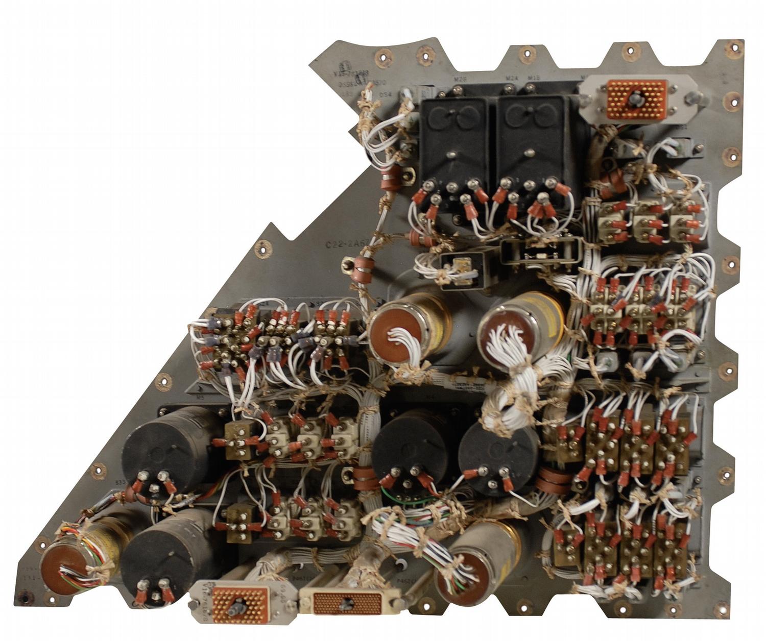 Electrical power instrument panel from an original Apollo Command Module of the old Block 1 spacecraft series. The item measures approximately 16.5 inches tall, 22 inches at its widest point, and weighs about 20 pounds. This panel, likely a back-up or training mechanism, is believed to be fully intact and bears an array of electronics, wiring, dials, and switches. Among the many printed identifiers are those marked “Fuel Cell Indicators,” “Battery Charger,” “H2 Purge,” “AC Inverter,” and “DC Indicator.” This is the same type of panel used by NASA during the mid-1960s in preparation for the Apollo 1 mission, which claimed the lives of astronauts Gus Grissom, Ed White, and Roger Chaffee in 1967. North American Aviation sold the remaining parts from the Apollo program after the accident. According to our consignor, this rare and beautiful Apollo-era artifact has been held in his private collection for at least 30 years. Interesting and unusual early Apollo-era hardware.