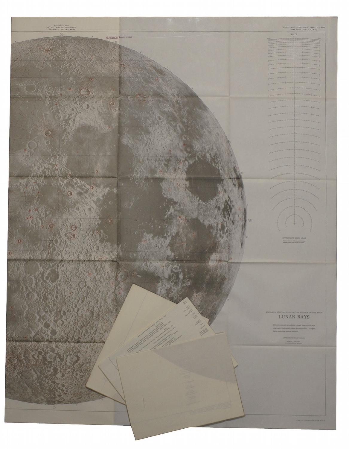 Four US Department of the Interior US Geological Survey maps, dated 1961 and entitled “Engineer Special Study of the Surface of the Moon,” 52.5 x 38.5. Three maps show colorized versions of the lunar surface with the fourth bearing specific findings. The pages are contained within their original brown paper envelope. In fine condition, with intersecting folds (as issued) and some toning along the fold lines.