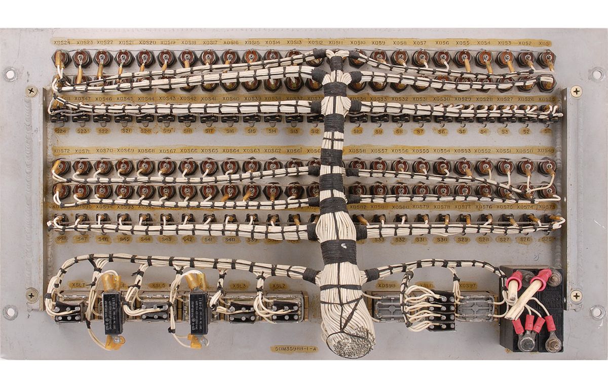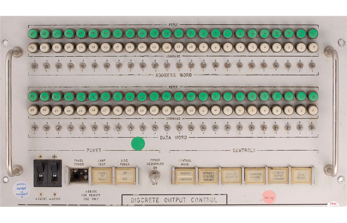 Discrete Output Control panel from the Kennedy Space Center. Panel measures 19 x 10.5, is labeled at the bottom, “Discrete Output Control,” with four rows of 23 numbered buttons, 46 small switches, and nine control buttons along the bottom. There is a NASA property sticker affixed to lower left corner. One button cover missing, a couple other small labels, and expected wear, otherwise fine condition.