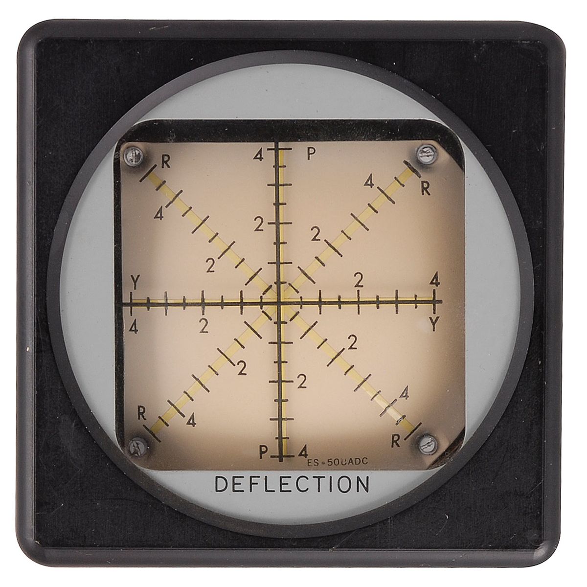 Functioning Engine Deflection Gauge. Gauge and panel measures 4.5 x 4.5 x 5.5 and bears a Simspon Electric manufacturing label. Gauges like this one would be used in the Firing Room for measuring the deflection of the rocket stages during launch, measuring pitch, yaw, and attitude. In fine condition.