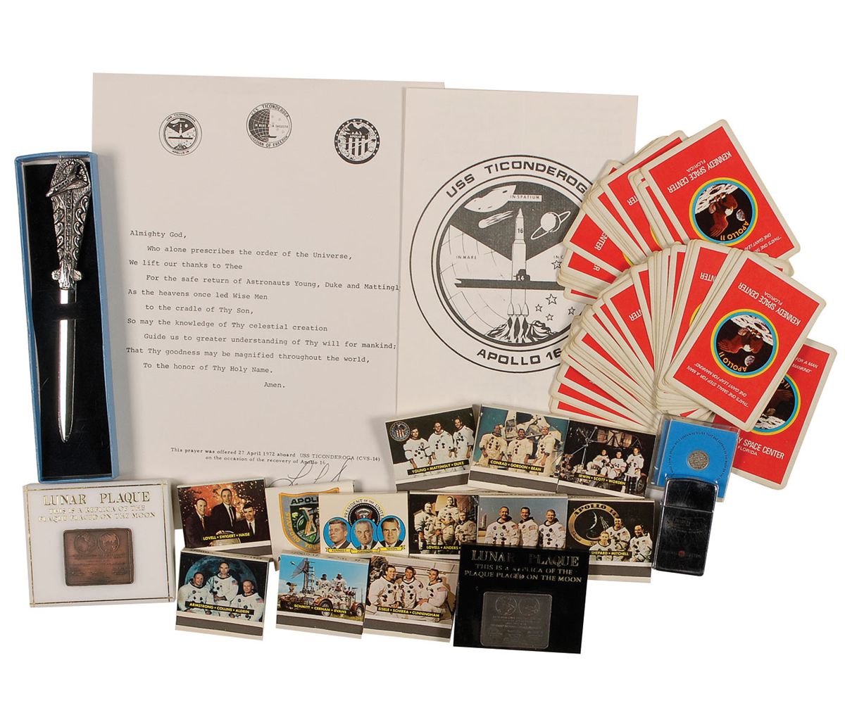 Nine items: complete set of 12 matchbooks, each commemorating one of the Apollo missions plus one honoring presidents John F. Kennedy, Lyndon B. Johnson, and Richard Nixon; deck of Kennedy Space Center playing cards featuring the Apollo 11 logo; two approximately 3.25 x 2.75 replicas of the plaque left on the lunar surface by the Apollo 11 crew; and a 6.5-inch long souvenir letter opener picturing a space shuttle; an Apollo 16 splashdown dinner menu, 5.25 x 8, two pages, for a celebration aboard the USS Ticonderoga, with the Apollo 16 astronauts as the guests of honor. Menu features many ‘space-related’ food items, including “Hadley Rille Green Salad,” “Taurus Littrow Grown Beef Steaks,” “Sonic Boom Baked Moon Rocks w/ Soure Creme,” and “Moon Mist Champagne from the ‘Sea of Nectar”; and a printed prayer on an off-white 8.5 x 11 sheet, offered aboard the Ticonderoga on the occasion of the recovery of Apollo 16, signed at the bottom in black ink by Lex L. Davis, Commander, Chaplain Corps, of the US Navy; limited-edition Apollo 14 souvenir mini-coin, .5-inch diameter, commemorating the 1971 flight. The coin was made from a special melt of silver into which was placed 10,000 grains of silver carried aboard Apollo 14 on its voyage around the moon. The souvenir was originally presented to members of the Franklin Mint Collectors Society; and a Zippo ® lighter, 1.25 x 2.25 x .25, featuring the General Electric and Apollo Systems Department logos. The artifact was presented as a souvenir by General Electric. In overall fine condition, with the expected wear.
