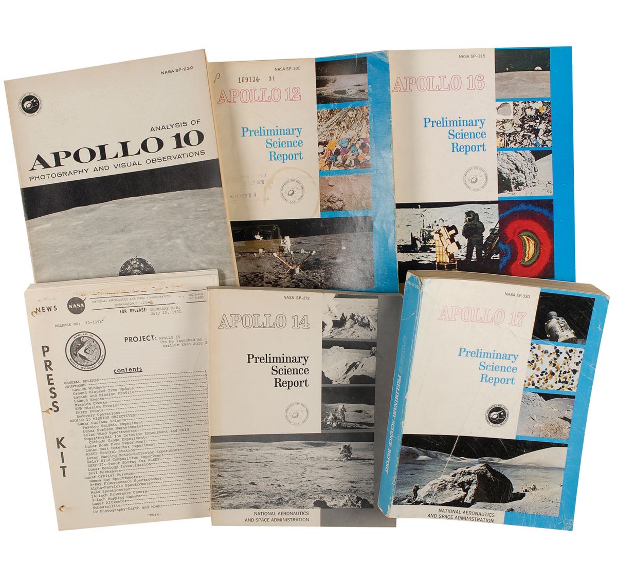 Six items: Analysis of Apollo 10 Photography and Visual Observations, 8.5 x 11, issued by NASA’s Scientific and Technical Information Office in 1971, 226 pages, analyzing the Apollo 10 crews observations and photographs of the lunar surface; Apollo 12 Preliminary Science Report, issued by NASA’s Scientific and Information Division in 1970, 8 x 10.5, 226 pages. Report is full of photos and evaluations of the mission, and is stamped on the front cover “Technical Office Library, British Aircraft Corpn”; Apollo 14 Preliminary Science Report, issued by NASA’s Scientific and Information Division in 1971, 8 x 10.25, 309 pages. Report is full of photos and experiment results from the mission, and is stamped on the front cover “NASA SP-272”; Apollo 15 press kit, 8 x 10.5, 157 pages, dated July 15, 1971. Kit provides detailed information and diagrams covering the Apollo 15 mission from launch to recovery, moonwalks, and experiments; huge Apollo 16 Preliminary Science Report, issued by NASA’s Scientific and Information Division in 1972, 7.75 x 10.25, 309 pages. Report is full of photos and experiment results from the mission, and is stamped on the front cover “NASA SP-315”; and a huge Apollo 17 Preliminary Science Report, issued by NASA’s Scientific and Information Division in 1973, 8 x 10. Report is full of photos and experiment results from the mission, and is stamped on the front cover “NASA SP-330.” In very good to fine condition, with scattered toning, creasing, and the expected wear.