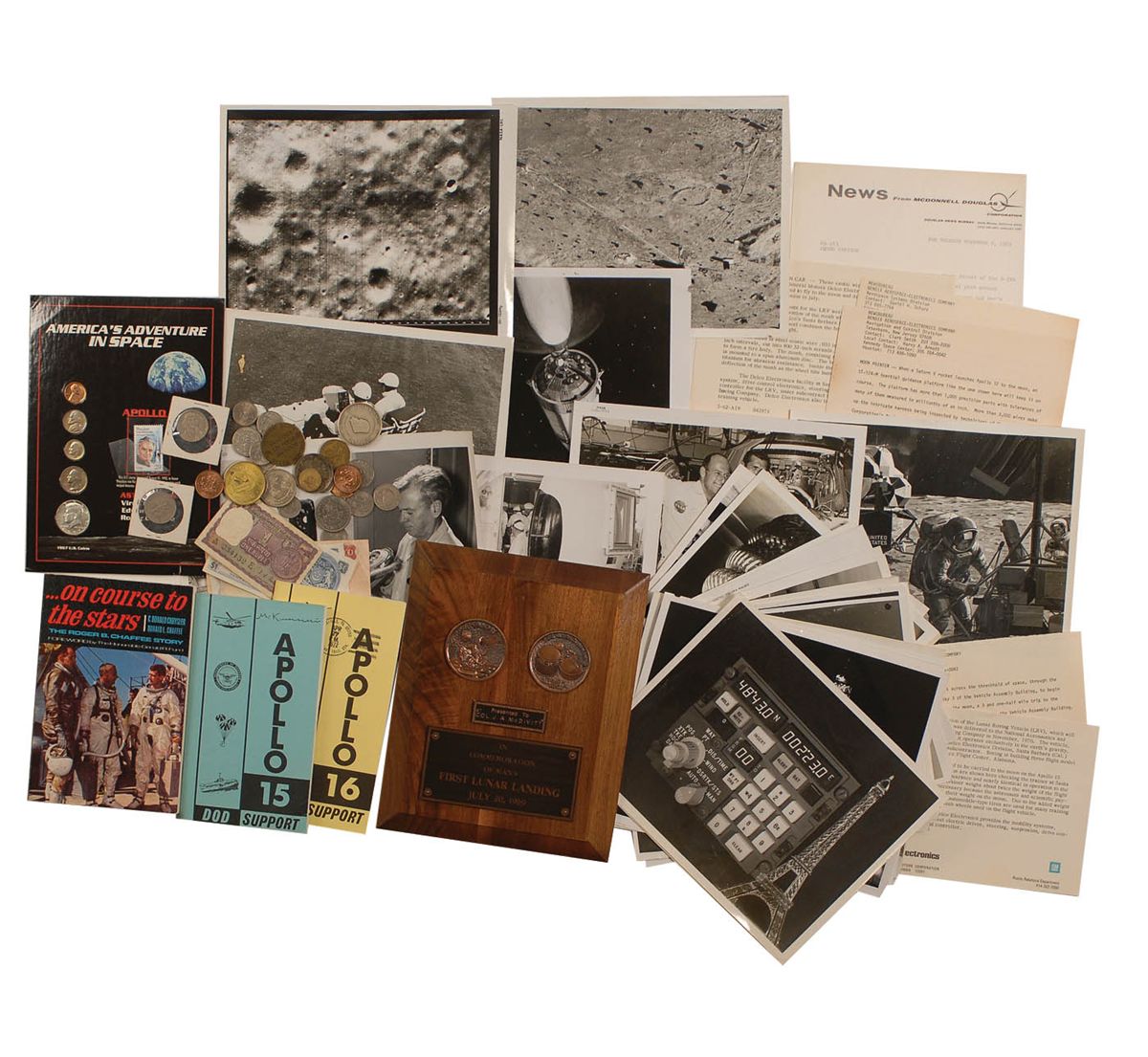 An eclectic mix of approximately 40 pieces of paper currency, coins, and novelty pieces accumulated by Gene Cernan during a 1973 trip around the world; Apollo 15 and 16 DOD Support booklets; a softcover copy of On Course to the Stars, signed and inscribed by Blanche and Don Chaffee, Roger Chaffee’s parents; a commemorative display featuring a United States 29-cent postage stamp, 1 x 1.5, issued on August 31, 1992, honoring Theodore von Karman. Stamp is removably incorporated into an Apollo 01 commemorative display, featuring five coins of different denominations issued in 1967, to an overall size of 6.75 x 9.5; a lot of 36 unsigned vintage glossy NASA photos, both 8 x 10 and 10 x 8. Photos cover a wide range of subjects including mission and equipment preparations, crew photos, artist’s renditions of moon landings, training, and moon missions; and an 8 x 10 commemorative plaque, presented to Jim McDivitt, for his part in the Apollo 11 mission. In overall fine condition.