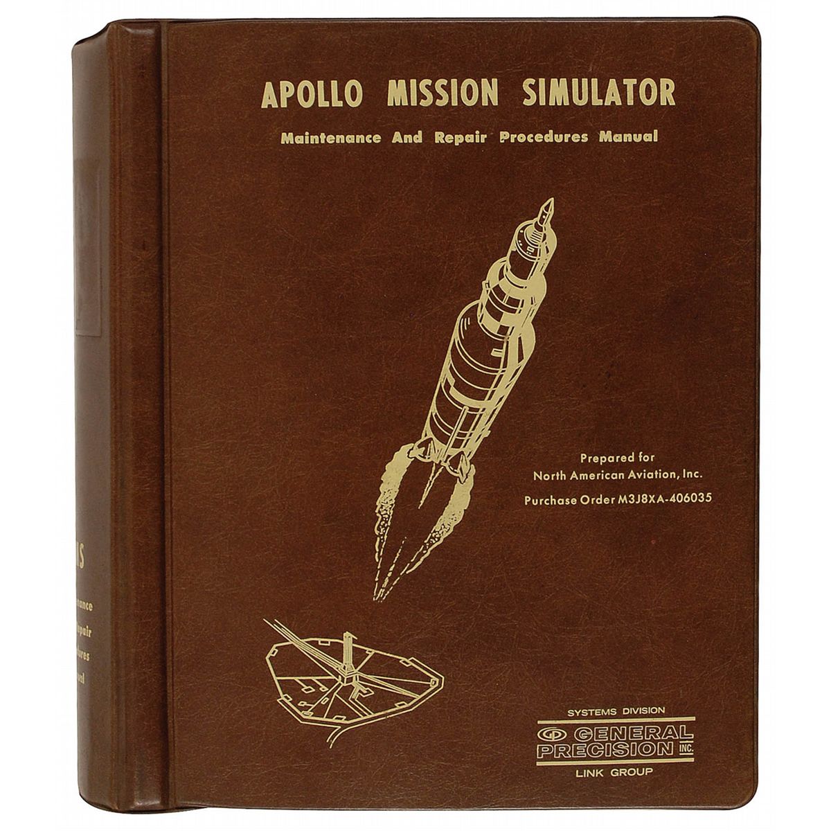 Scarce Apollo Mission Simulator Maintenance and Repair Procedures Manual, General Precision Inc., Section VIII, housed in a three-ring binder, measuring 10.25 x 11.5, and full of schematic diagrams. Beginning of the manual states “The Apollo Mission Simulator Visual System is designed to provide the astronaut with realistic "out the window" displays such as would be experienced during any phase of an actual Apollo mission. Simulation of the earth, moon, stars, spacecraft (in two windows) and other true to life images ranging from five feet to infinity is accomplished optically and electronically...The scenes viewed through the telescope and sextant duplicate the scenes...which might be viewed from the operational spacecraft in size, general appearances and relative distance.” In very good condition with overall toning. First time we have seen this volume.