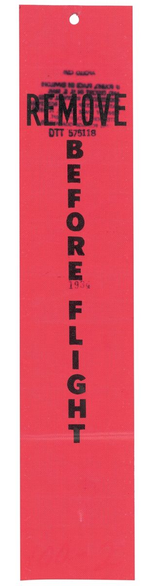 A red streamer, measuring 3 x 14.5, with “Remove Before Flight” printed on the front, and numbered DTT 575118, and return if found instructions printed on the reverse. In fine condition, with a few fold and creases. Accompanied by a certificate of authenticity from C. L. ‘Buddy’ Corbin of the Apollo Launch Team.