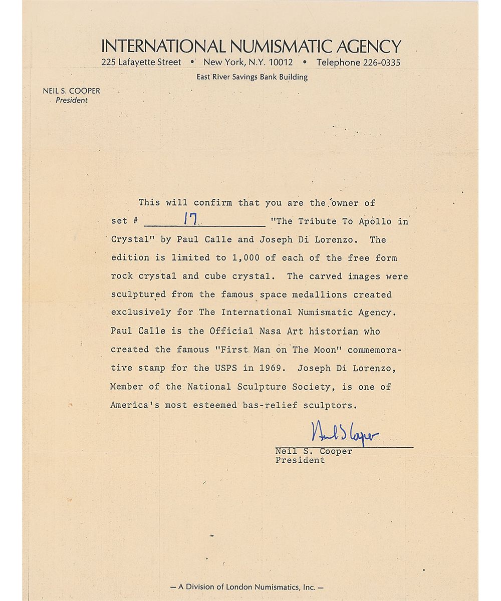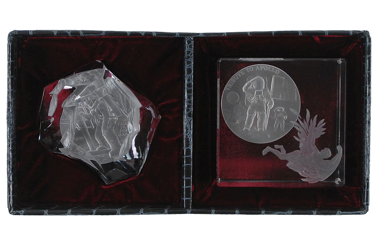 Limited edition two-piece set entitled “The Tribute to Apollo in Crystal,” by Paul Calle and Joseph Di Lorenzo, numbered 17/1000. One is a 4 x 4 x 1.25 ‘cube’ crystal and one is a 4 x 4 x 2 ‘free form’ crystal, both with etched designs showing Apollo astronauts on the lunar surface. Items are presented in their original red velvet lined box. In overall fine condition. Accompanied by a certificate of authenticity from the International Numismatic Agency.