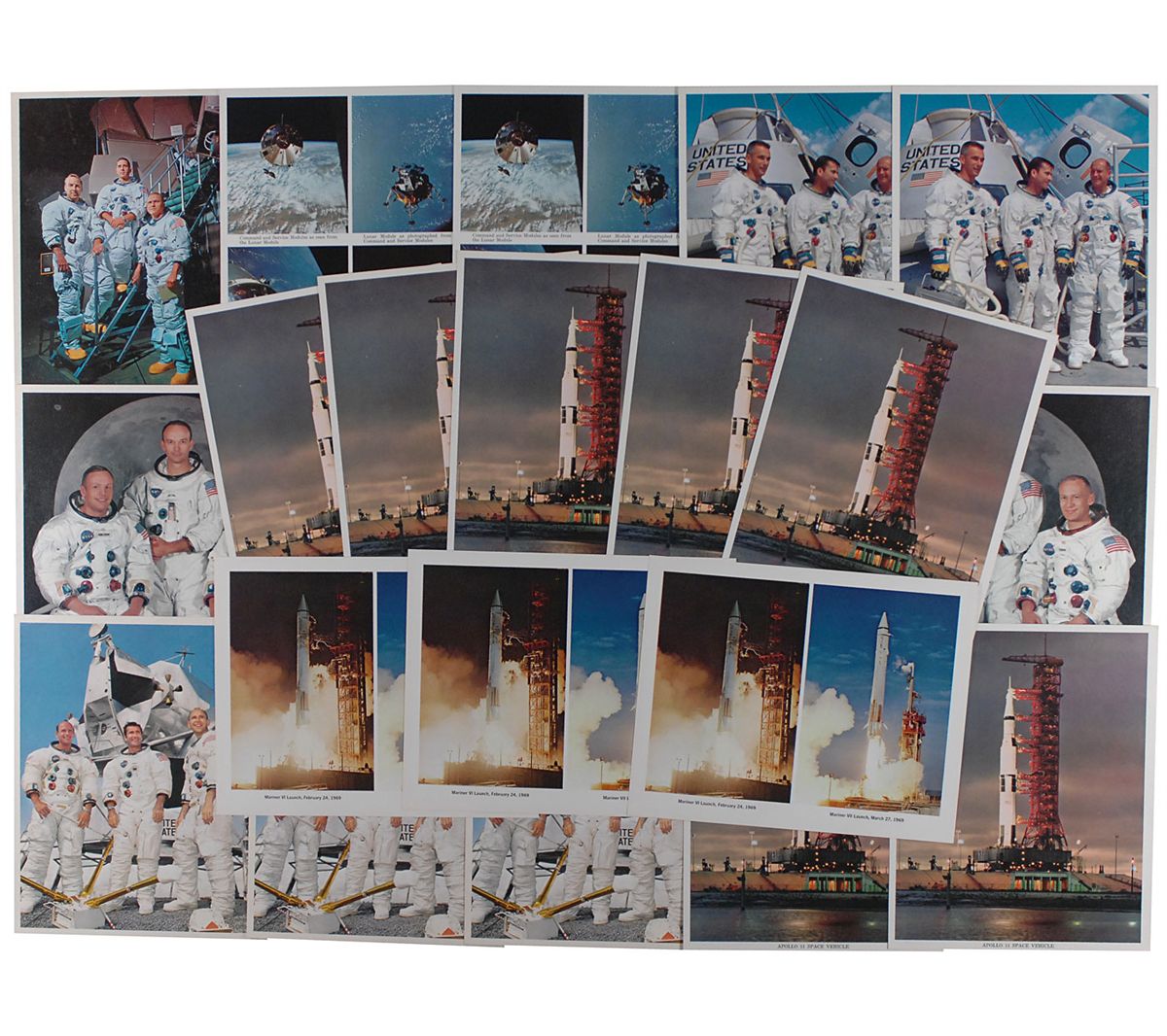 Collection of 22 original color NASA lithos, mostly from the Apollo program. Images include crew photos of Apollo 8, 9, 10, 11, and 12, as well as the Apollo 11 space vehicle and two composite photos of the launches of Mariner VI and VII. Also included is an Apollo lapel pin. In fine condition.